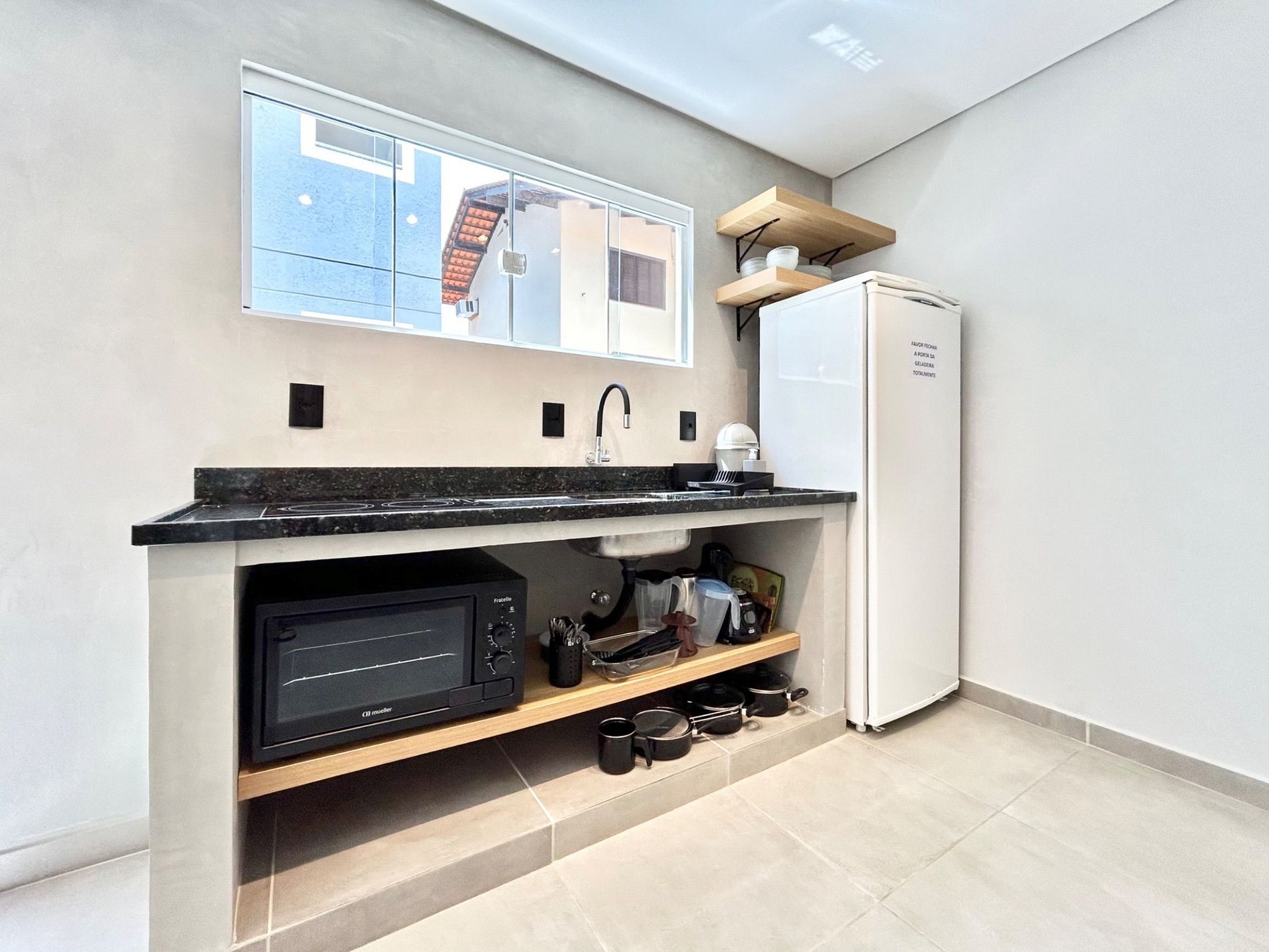 Cozinha equipada com geladeira, fogão e forno elétrico.