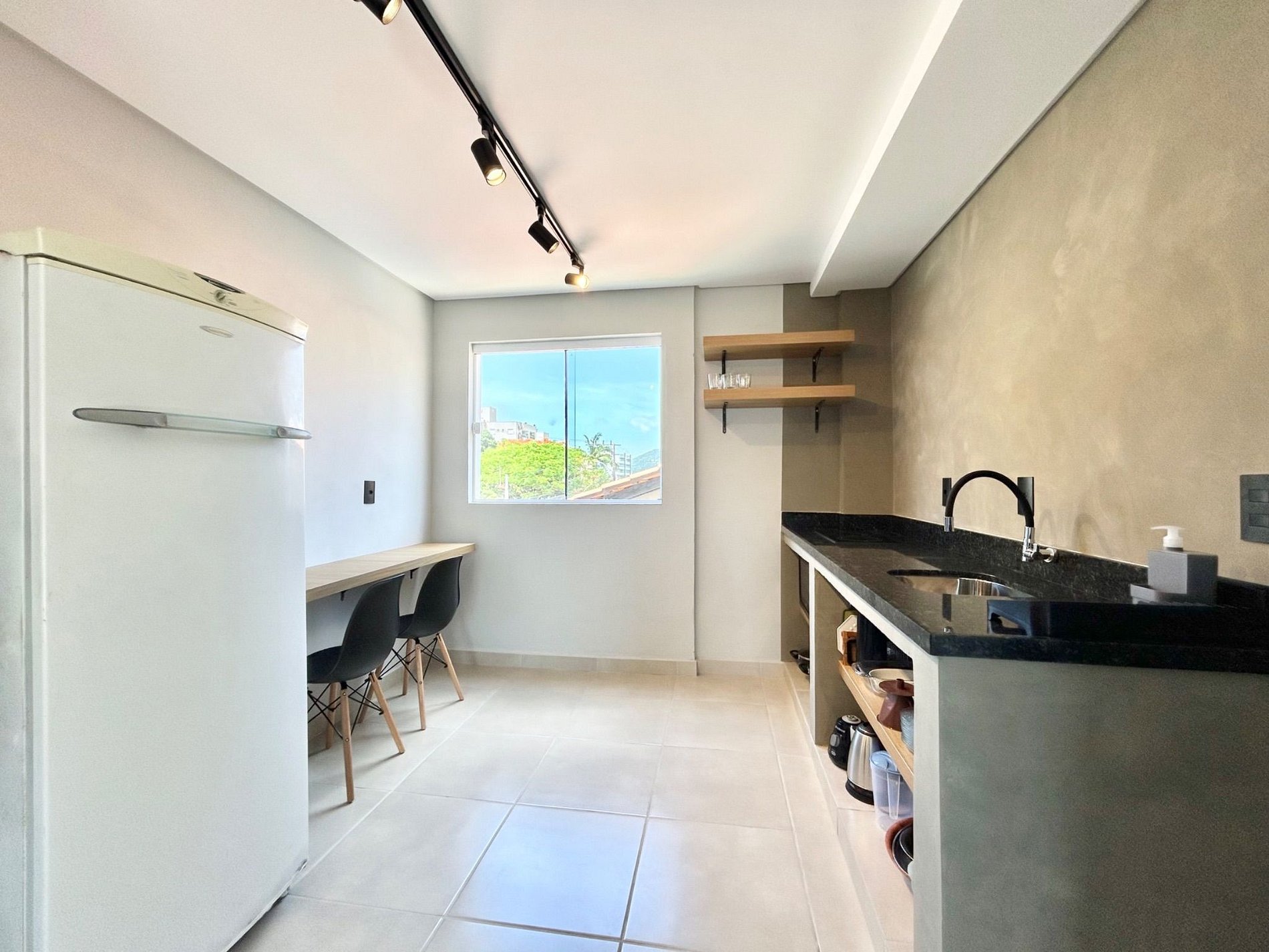 Cozinha equipada com geladeira, fogão e forno elétrico.