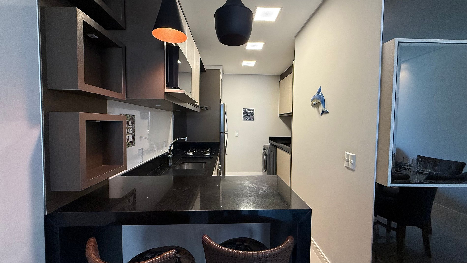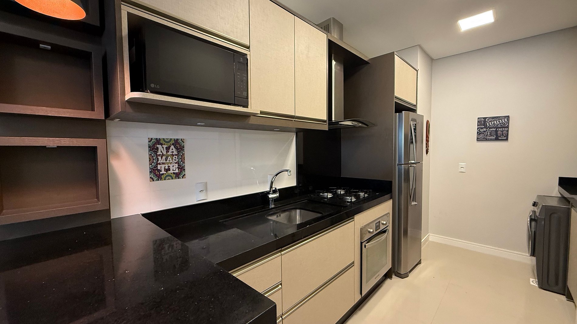 Cozinha completa com geladeira, micro-ondas, forno elétrico;