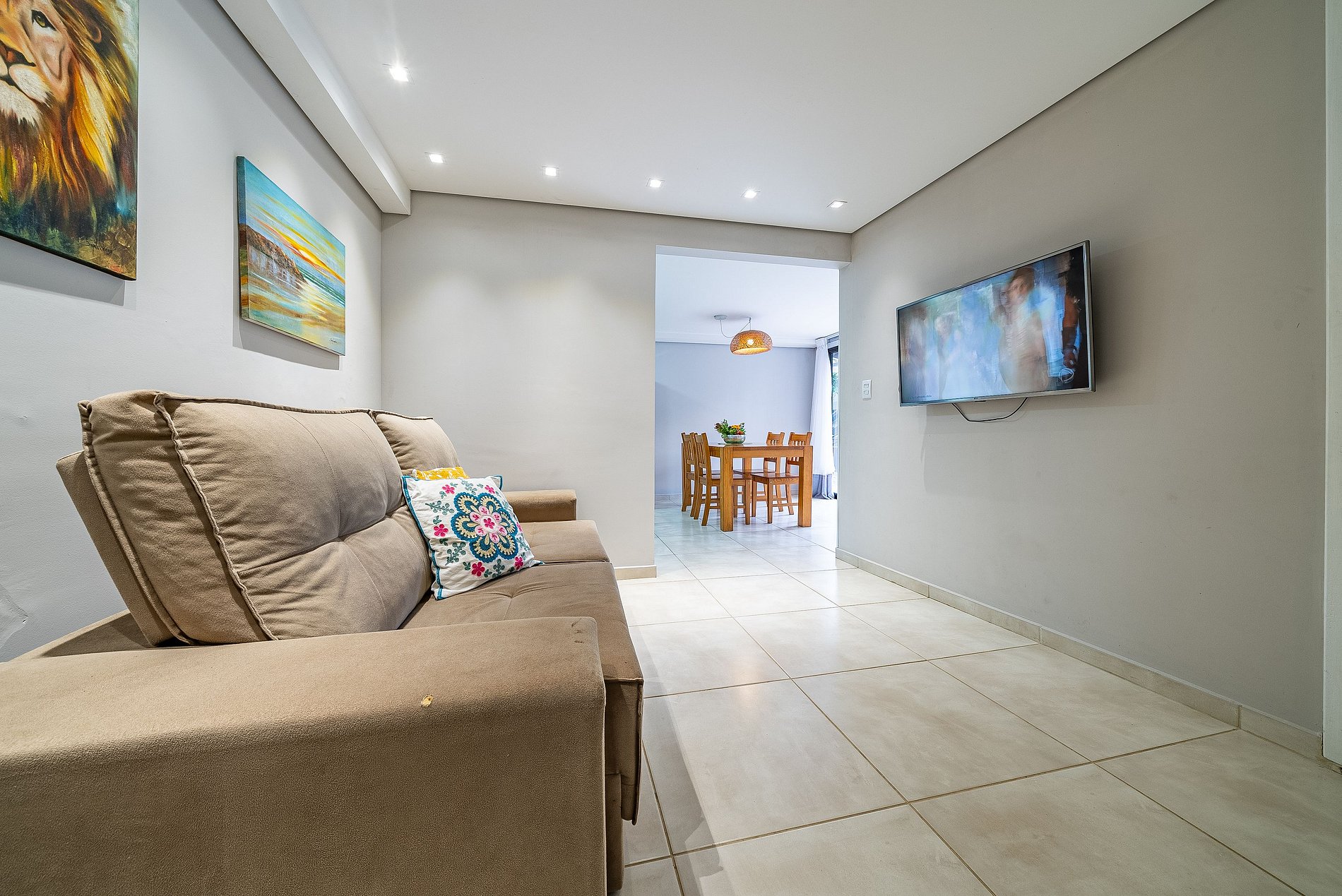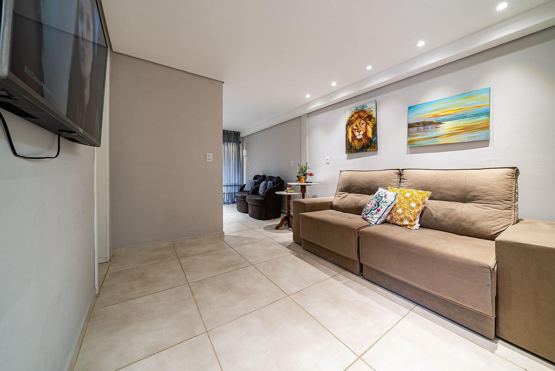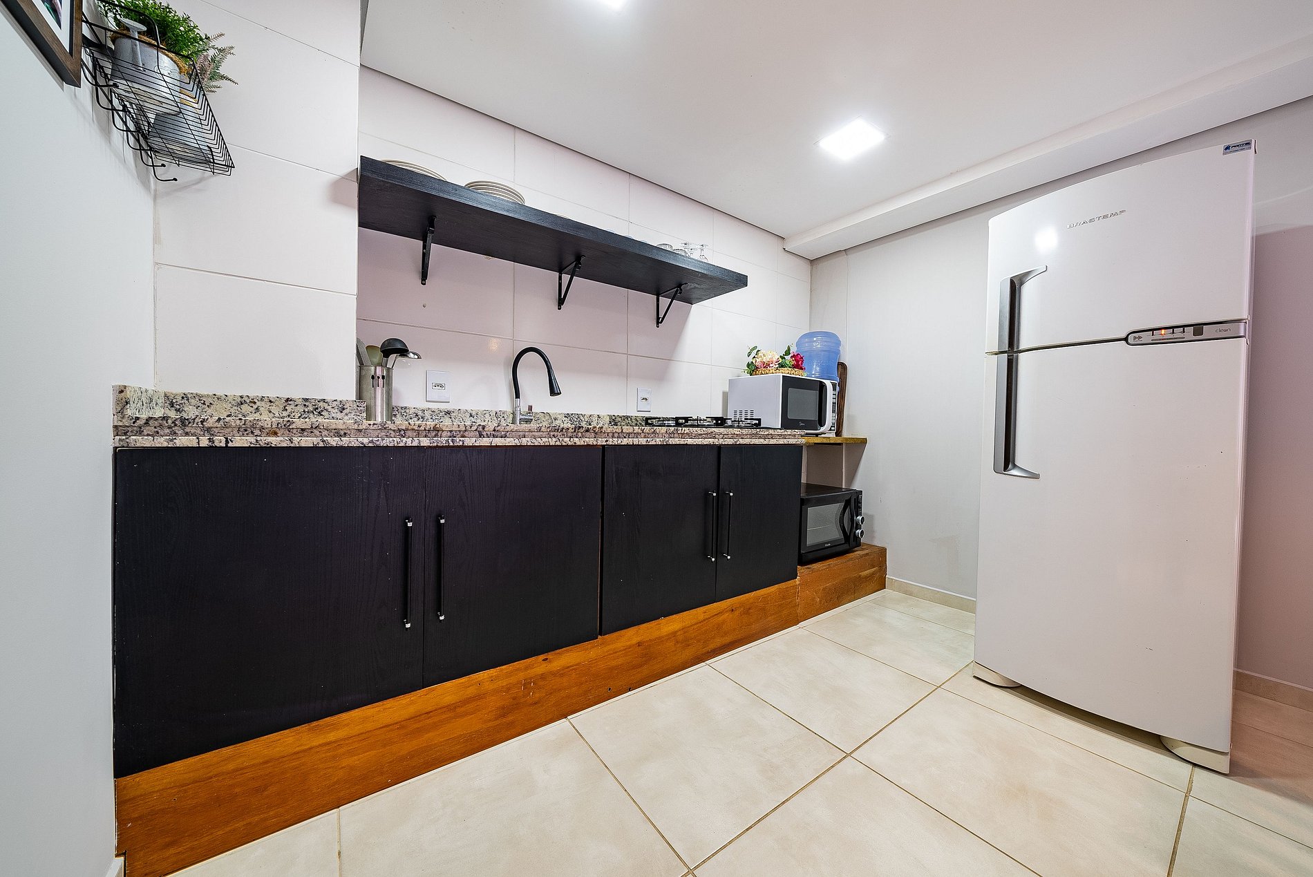 Cozinha equipadaSala de estar com sofá e TV.