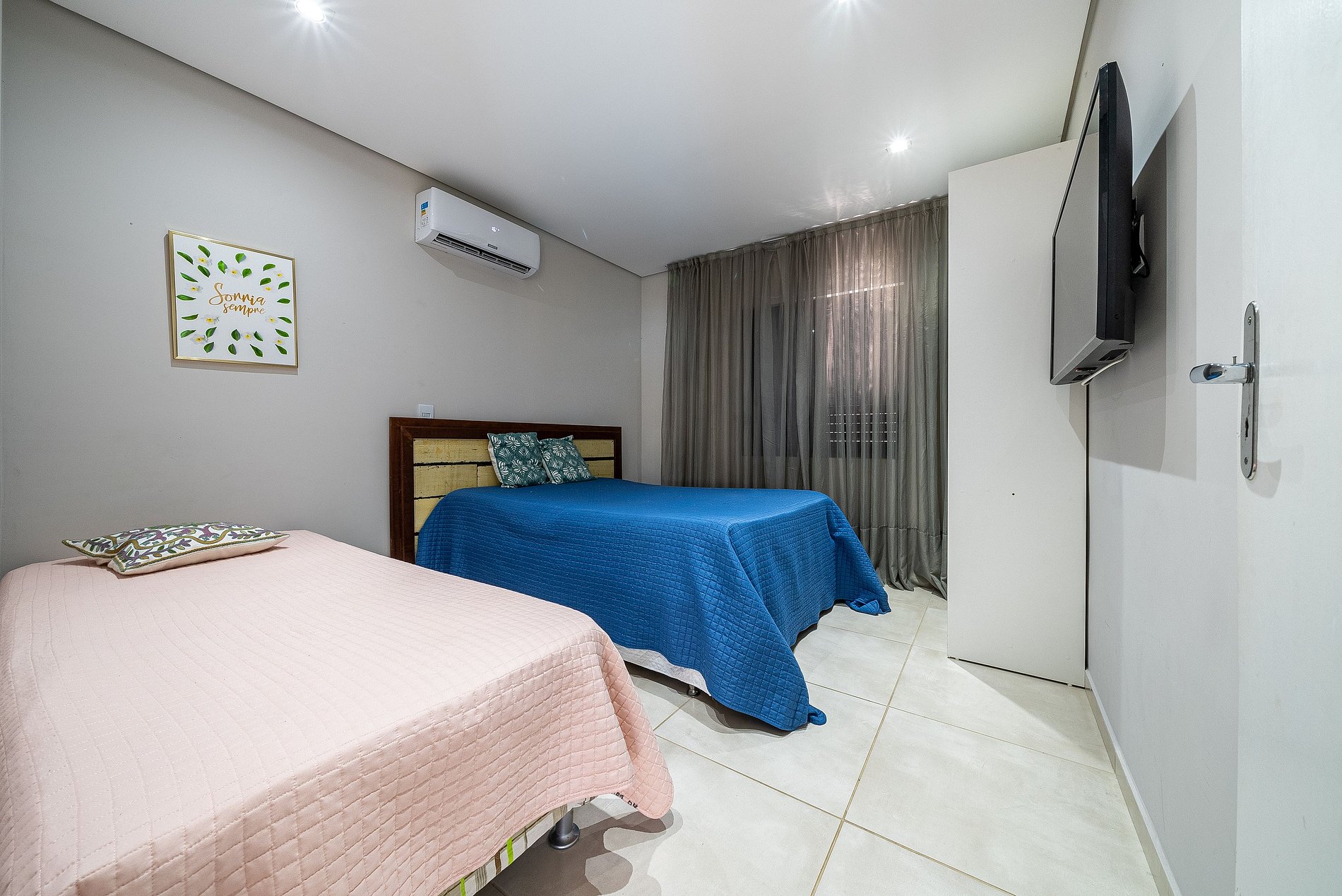 02 Dormitórios com 01 cama box de casal e 01 cama de solteiro, TV e ar condicionado;