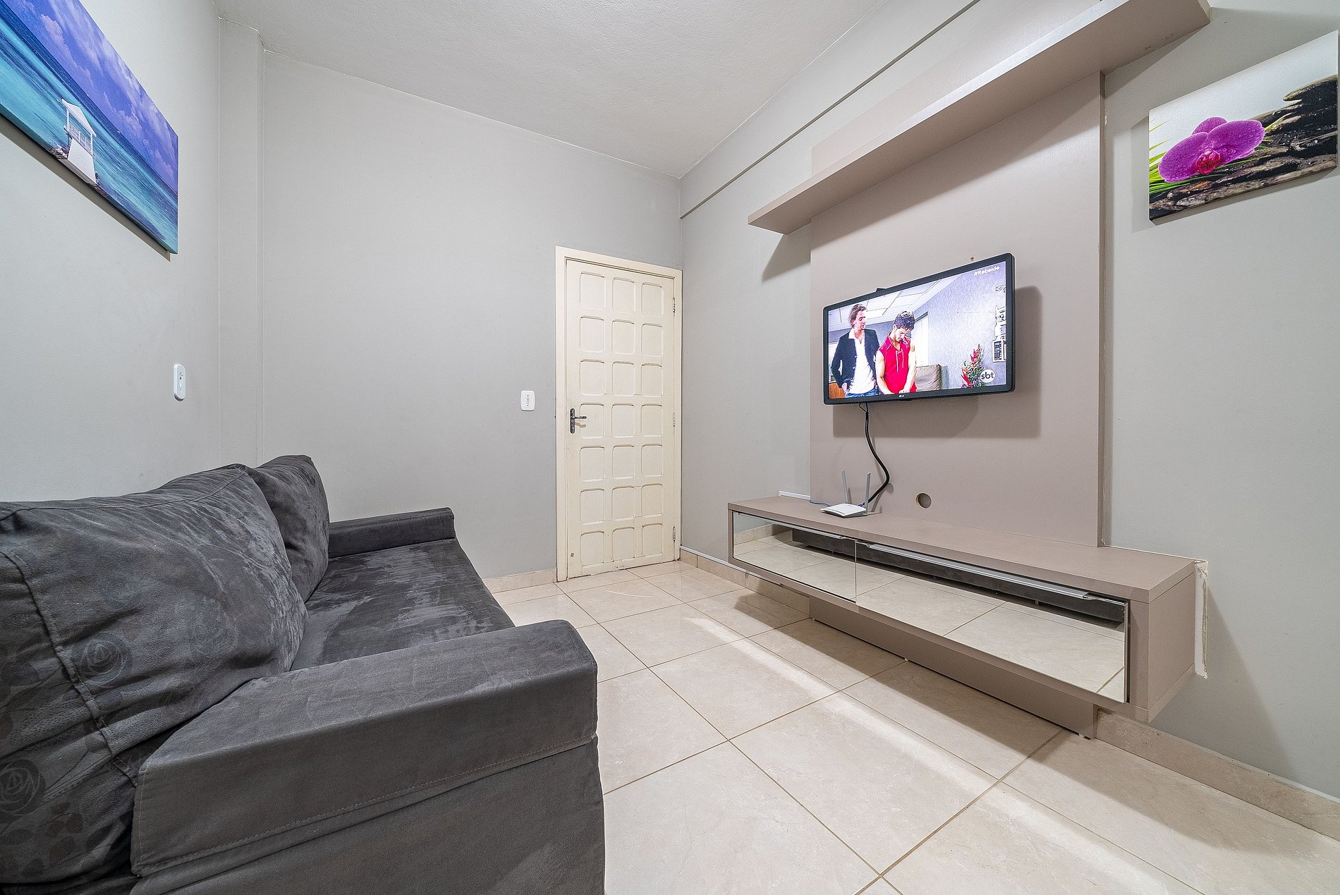 Sala de estar com sofá de 03 lugares e TV LCD.