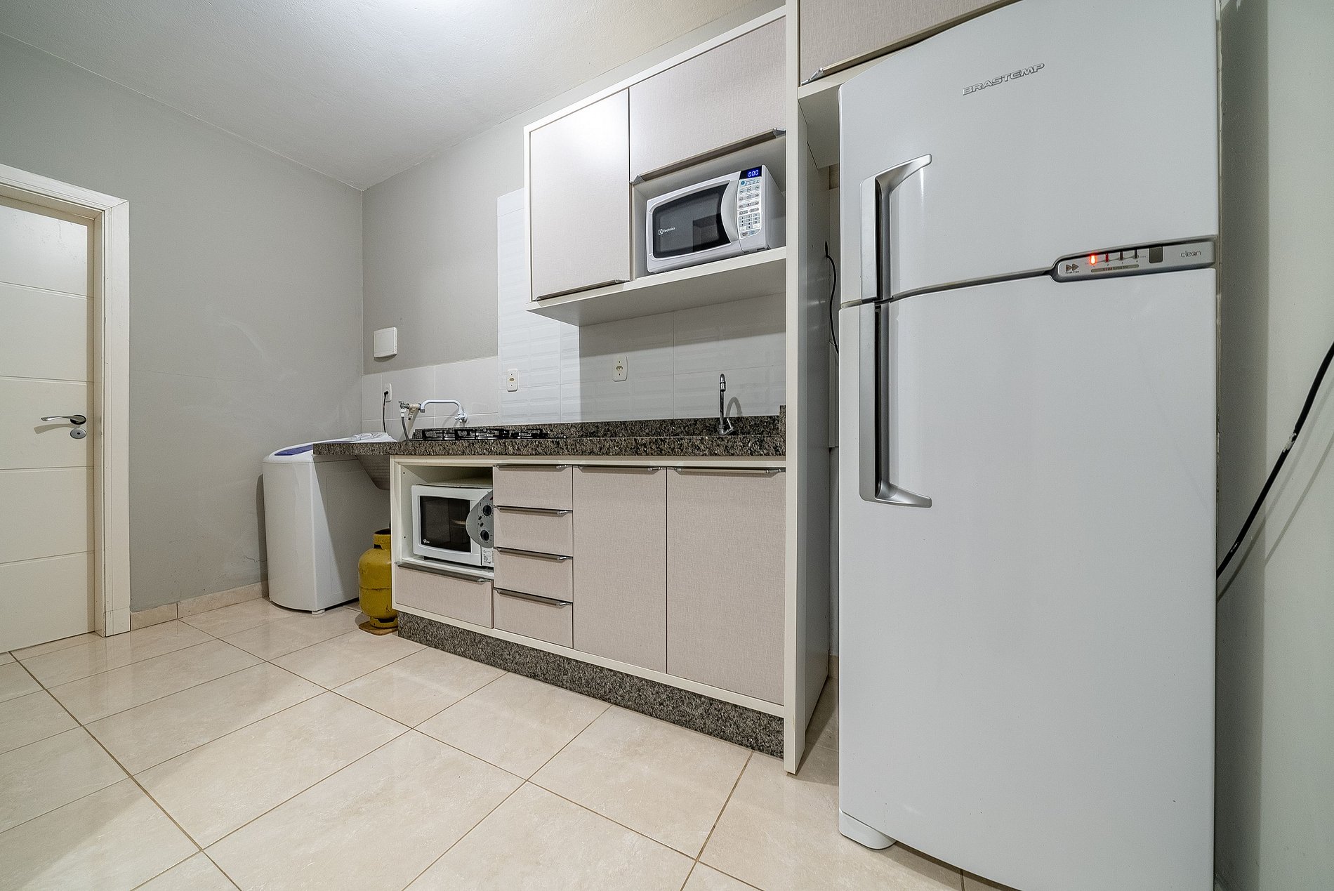 Cozinha muito bem equipada com geladeira, forno elétrico, micro-ondas, fogão de mesa 04 bocas e demais utensílios de cozinha.