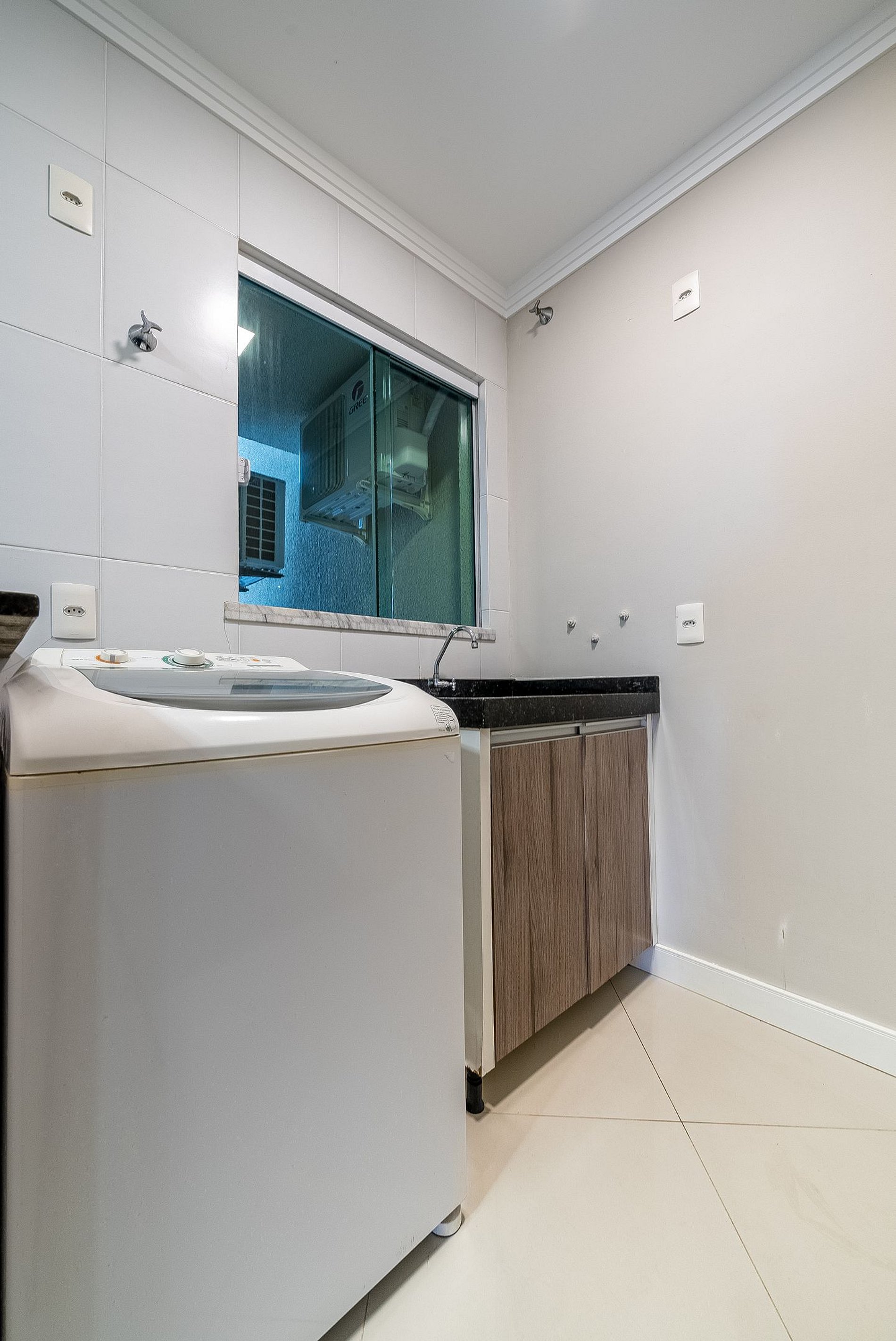 Área de serviço com lavadora de roupas e tanque