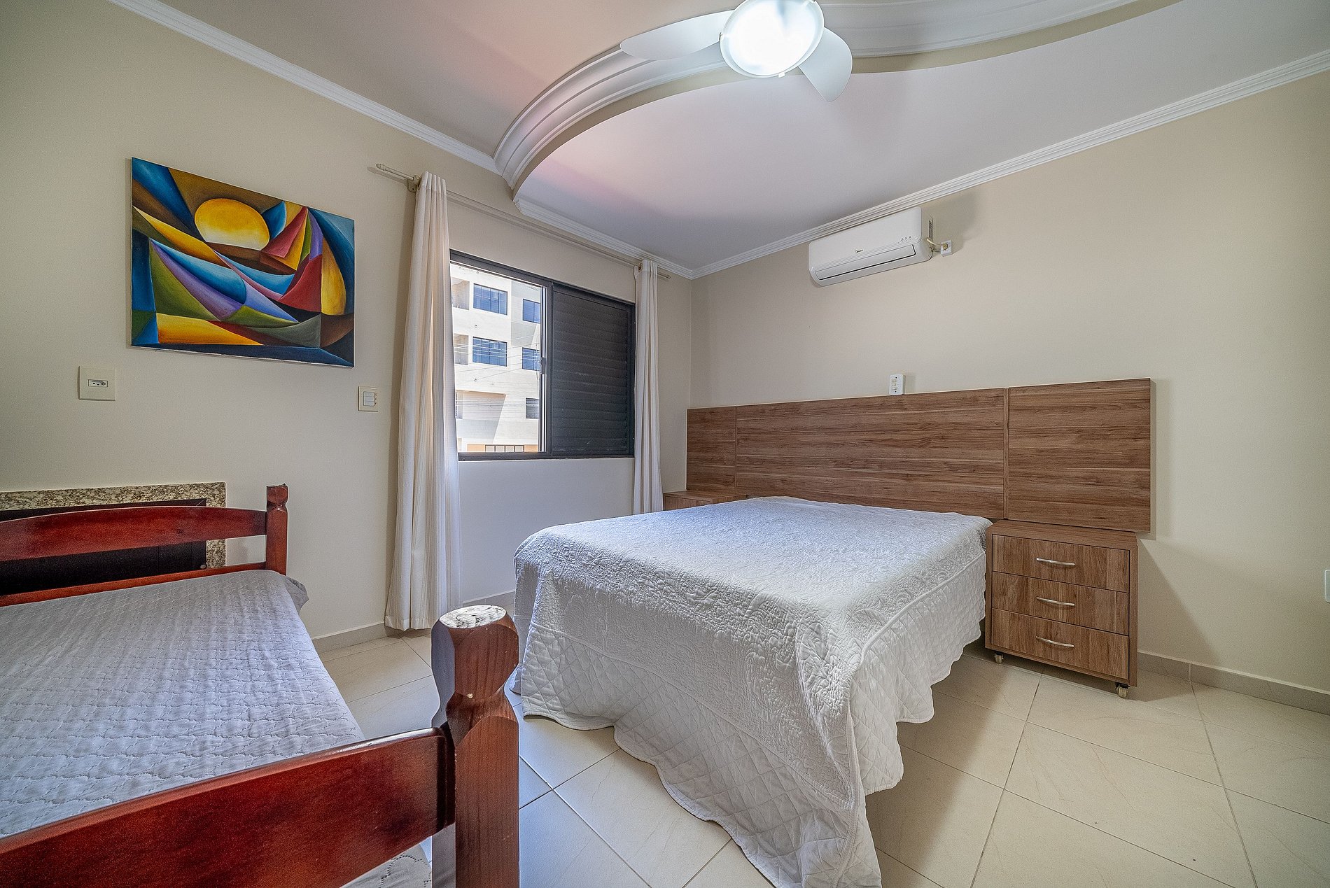 01 suíte com 01 cama casal Queen + 01 cama de solteiro, com ar condicionado e Smart TV