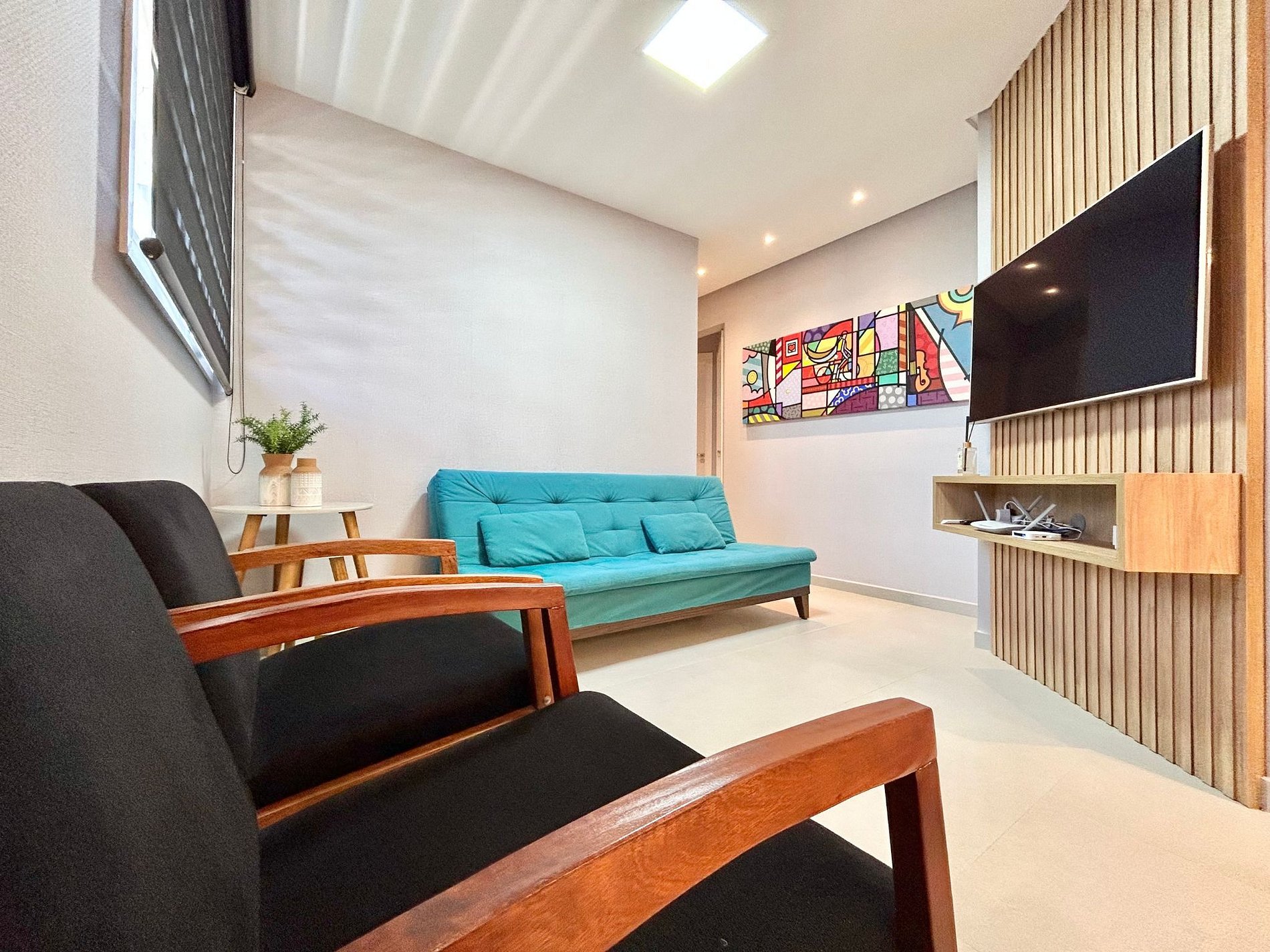 Sala de estar com 01 sofá cama e TV.