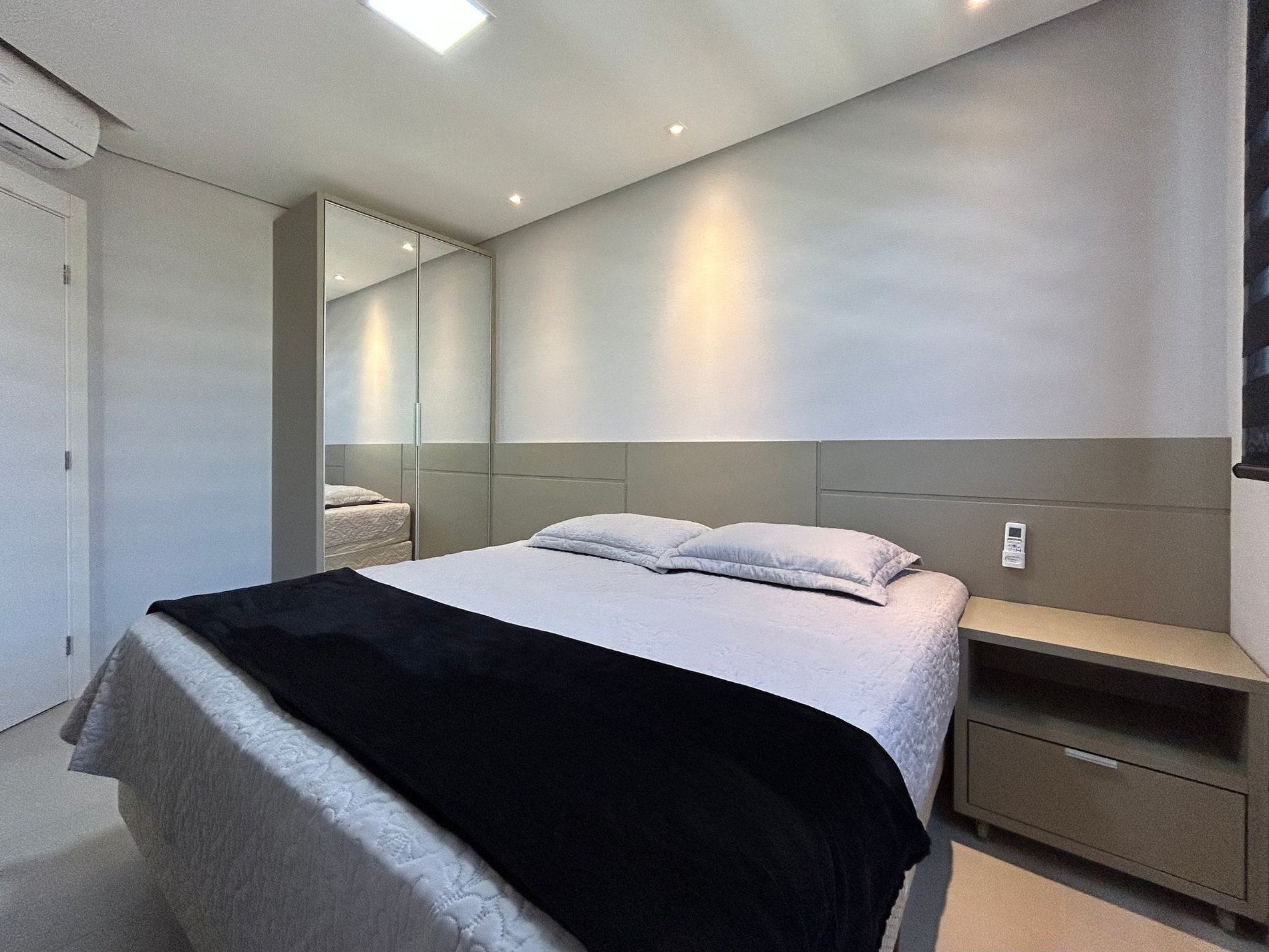 01 dormitório com 01 cama box de casal e ar condicionado.