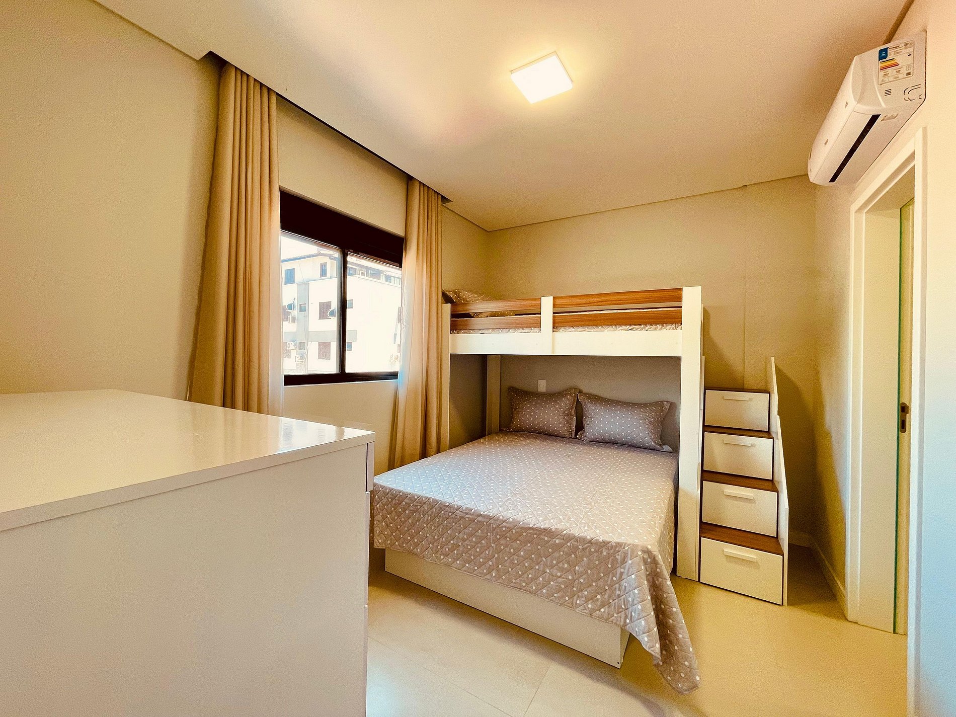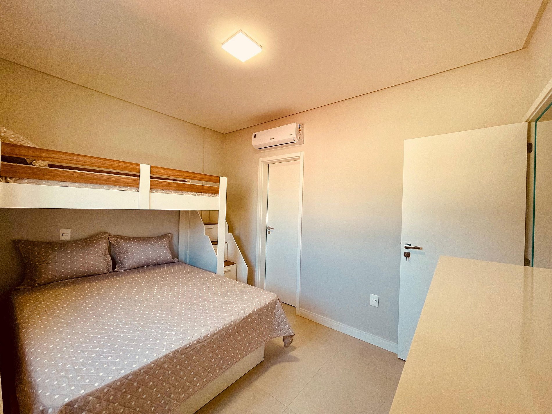 1 suíte climatizada com cama de casal e uma beliche de solteiro;