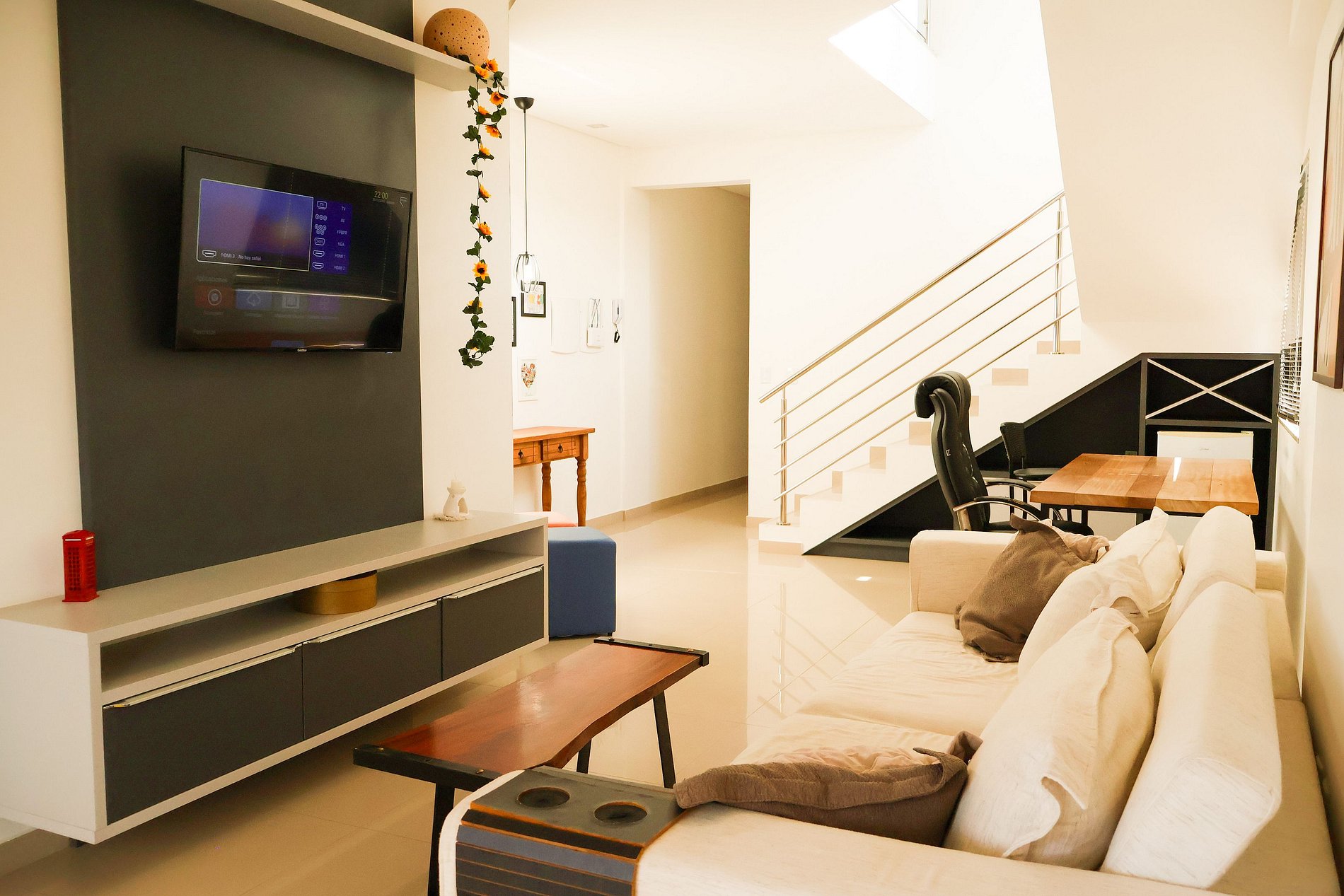 Sala de estar ampla, com Frigobar, decorada, ambiente acolhedor;