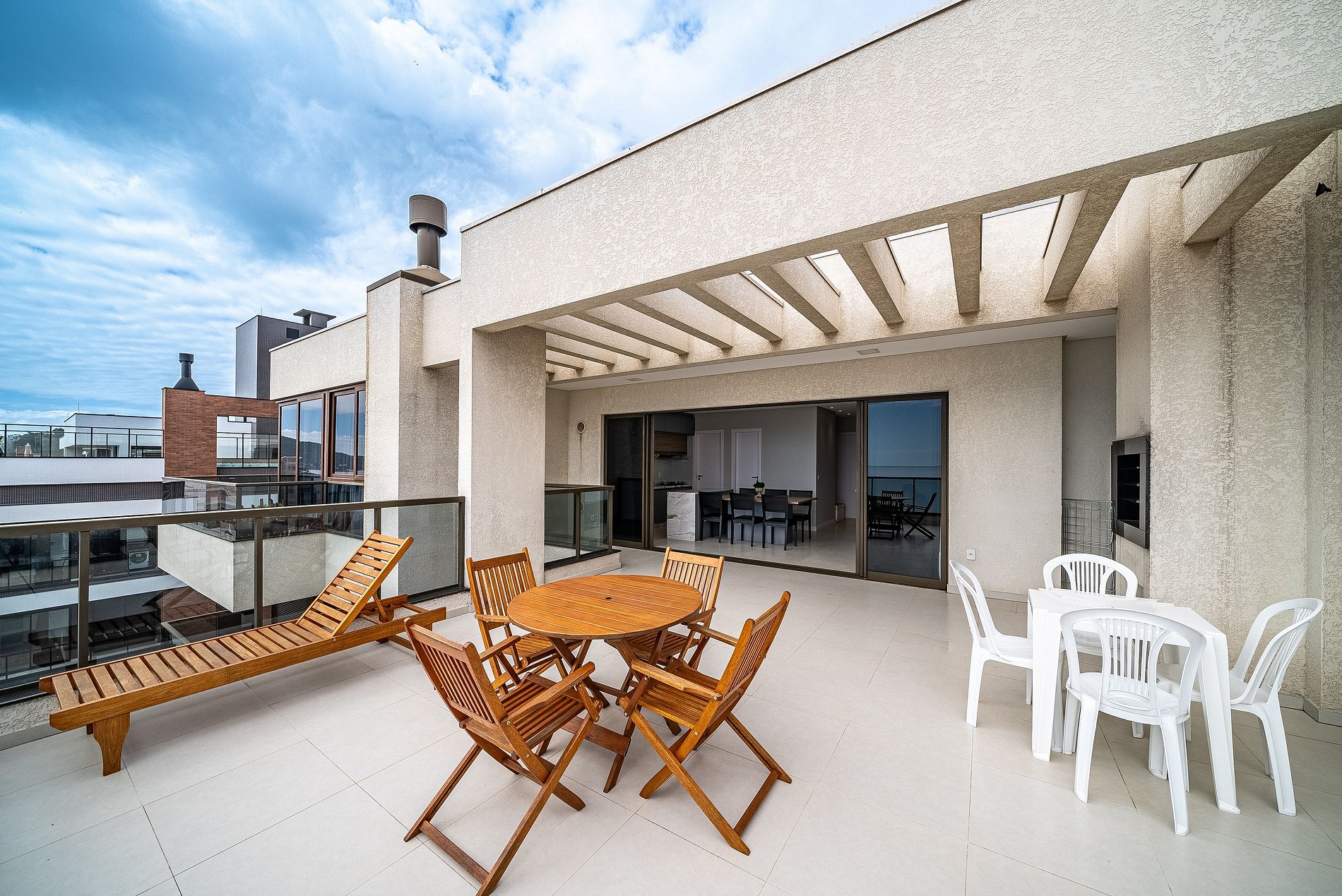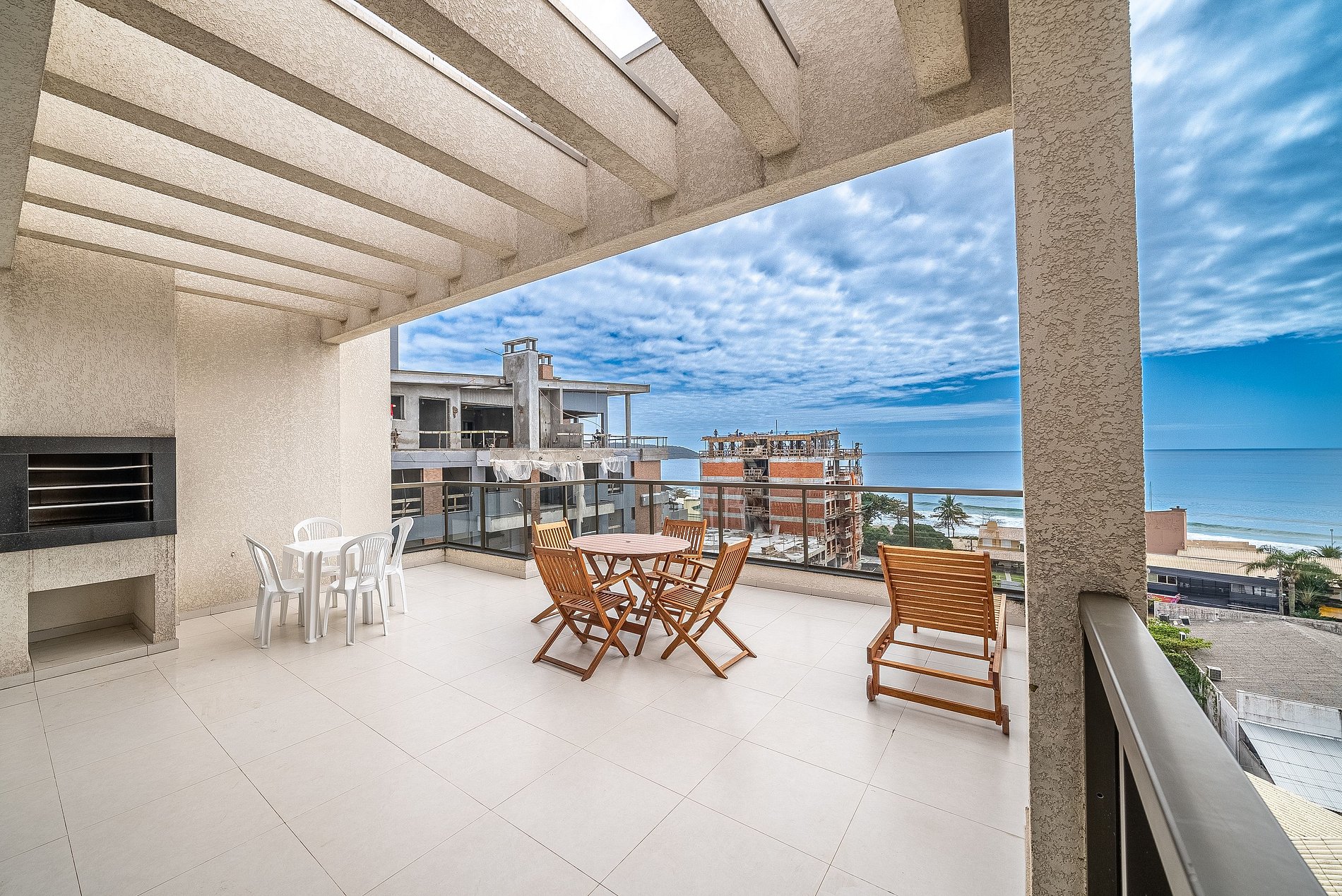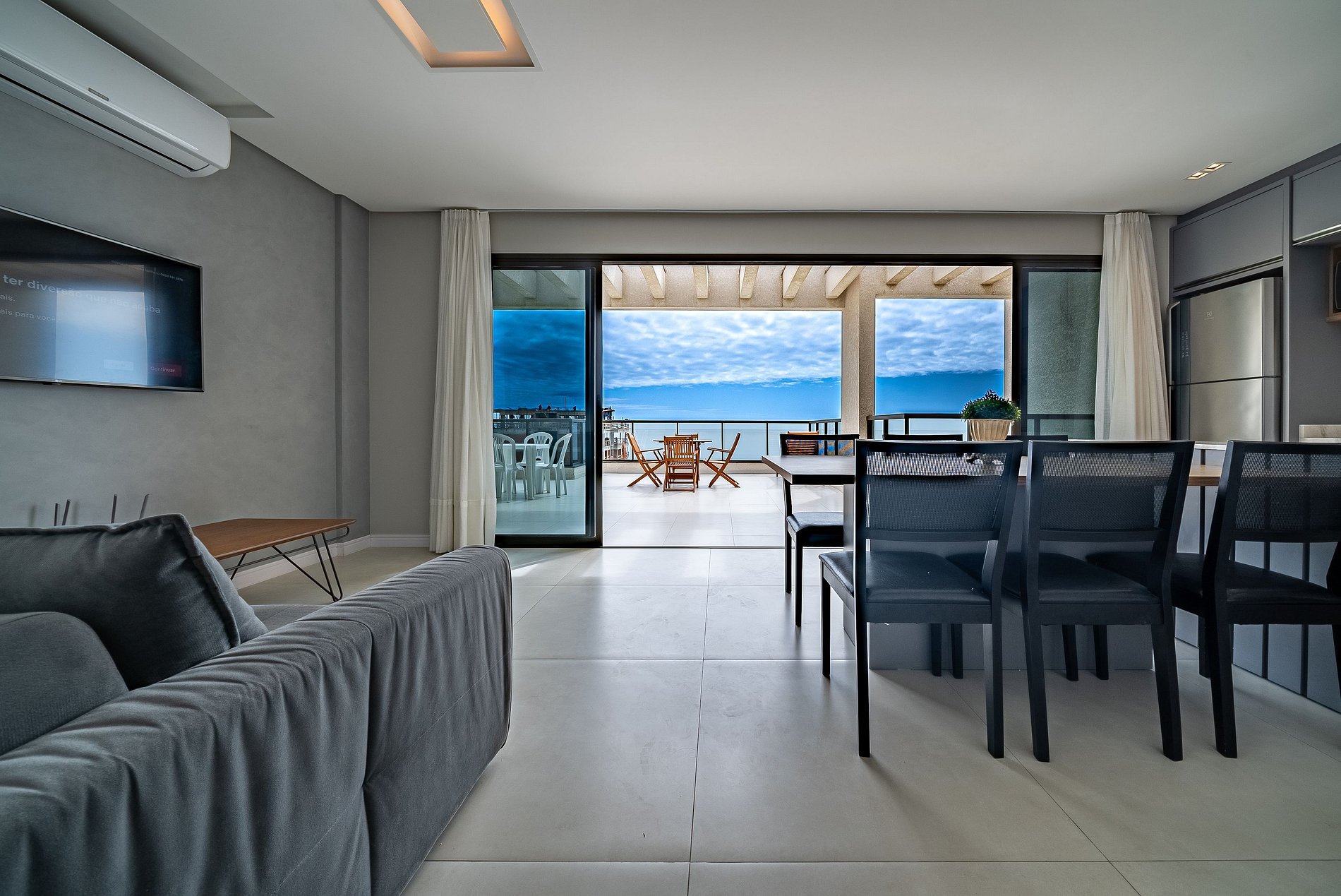 No piso superior, aproveite o terraço com churrasqueira e vista incrível pro mar, sala aconchegante, cozinha completa e lavabo.