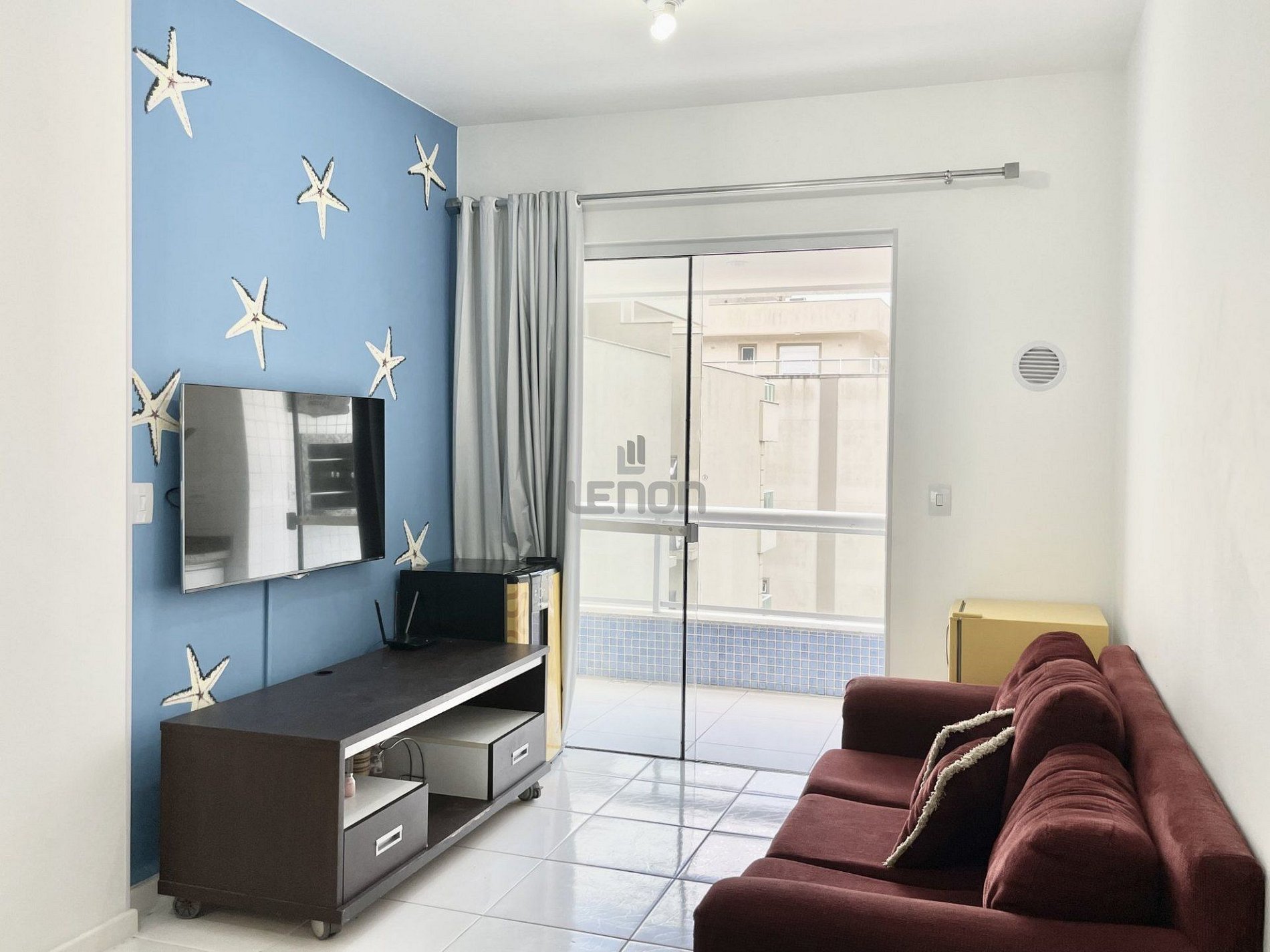 Sala de estar, sofá com 04 lugares, televisão e sacada