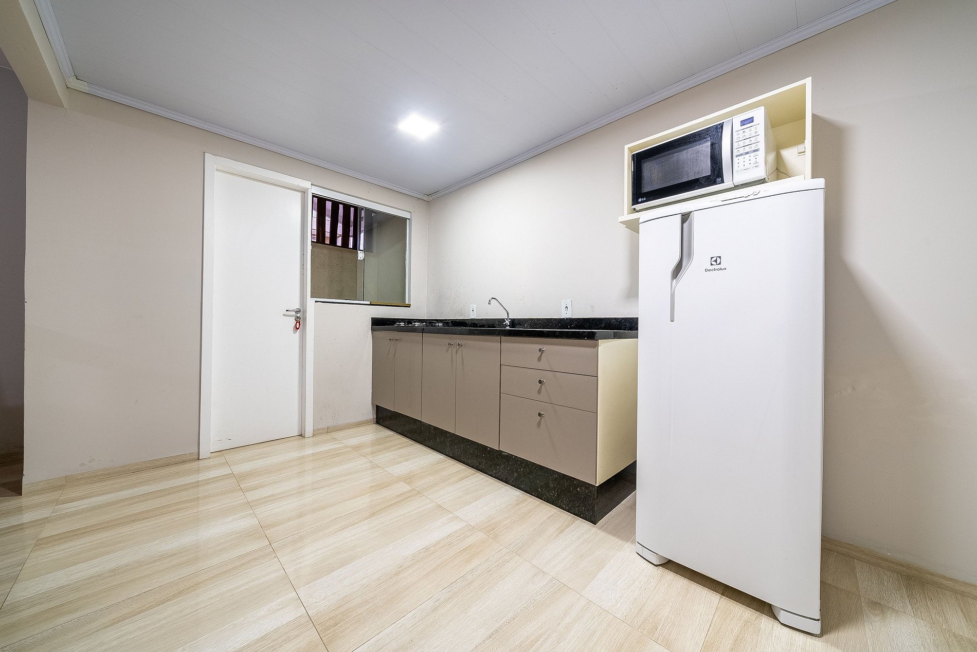 Cozinha equipada com geladeira, fogão e micro-ondas;