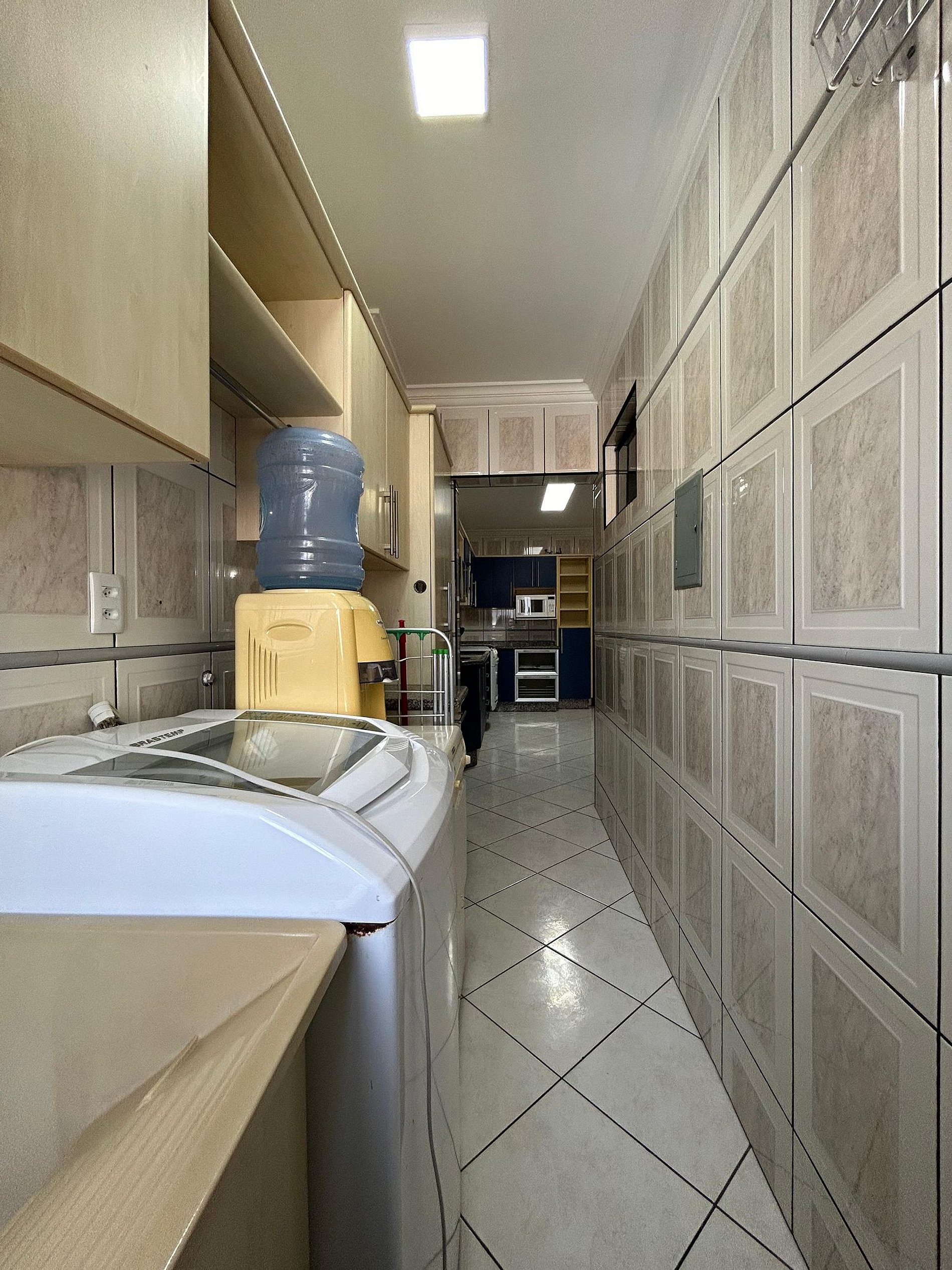 Área de serviço com máquina de lavar e tanque.