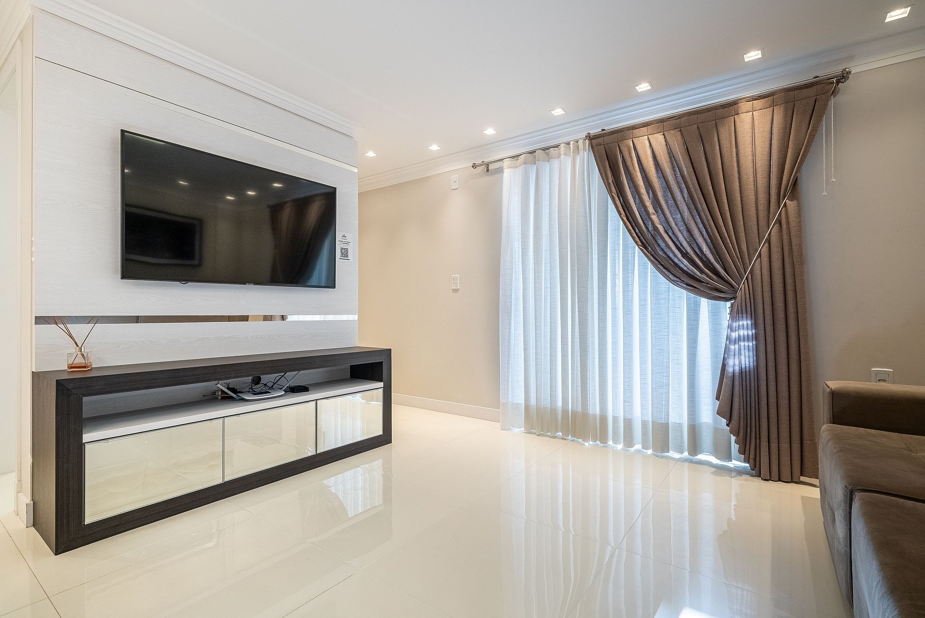 Sala de estar com amplo sofá e TV SMART