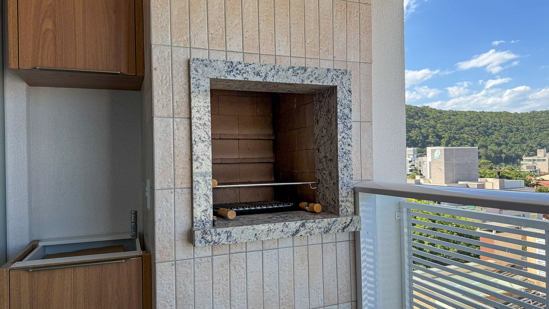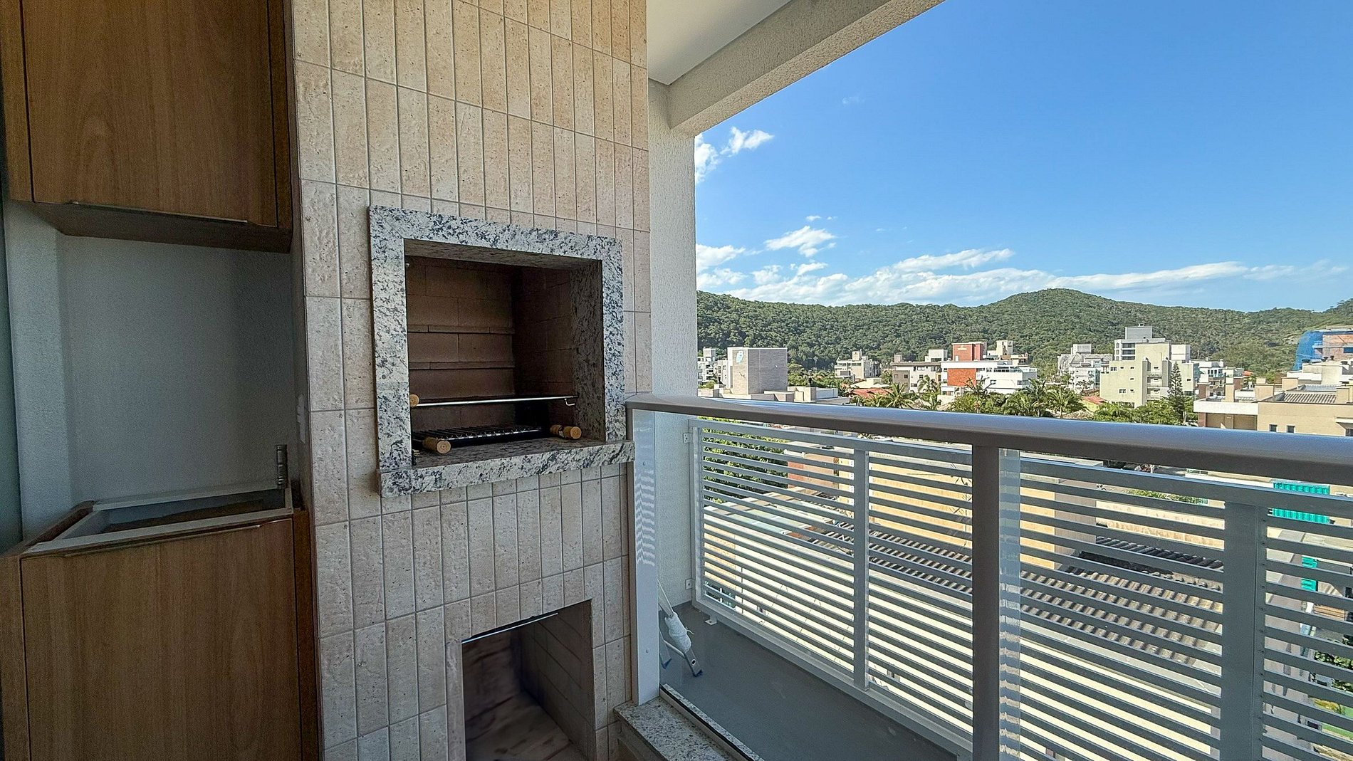 Sacada com churrasqueira e vista mar;