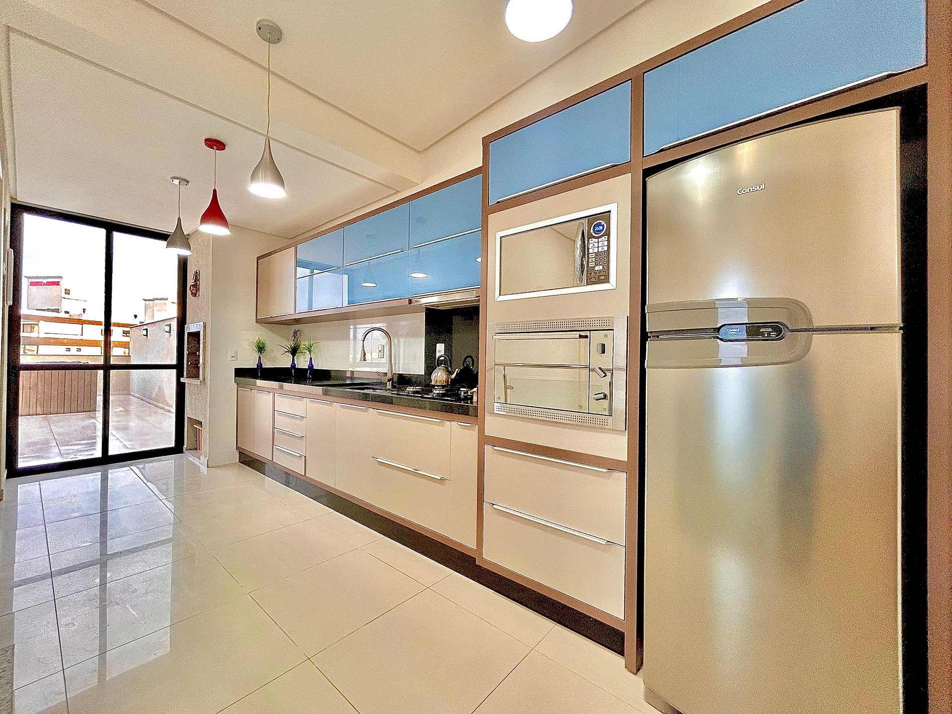 Cozinha totalmente equipada: geladeira, micro-ondas, forno elétrico e churrasqueira;