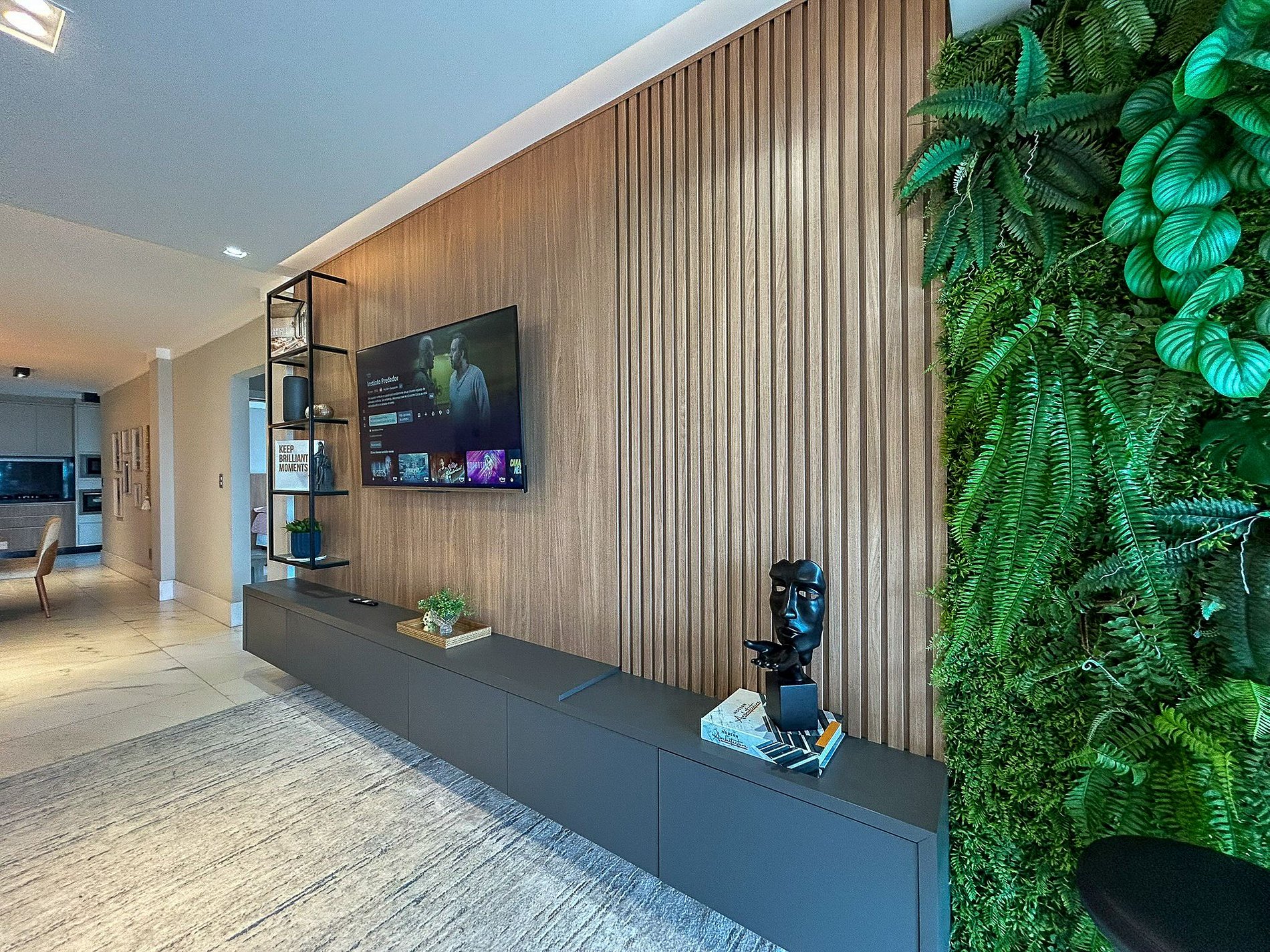 Sala de estar com TV Smart, iluminação via Led, Rebaixo em gesso