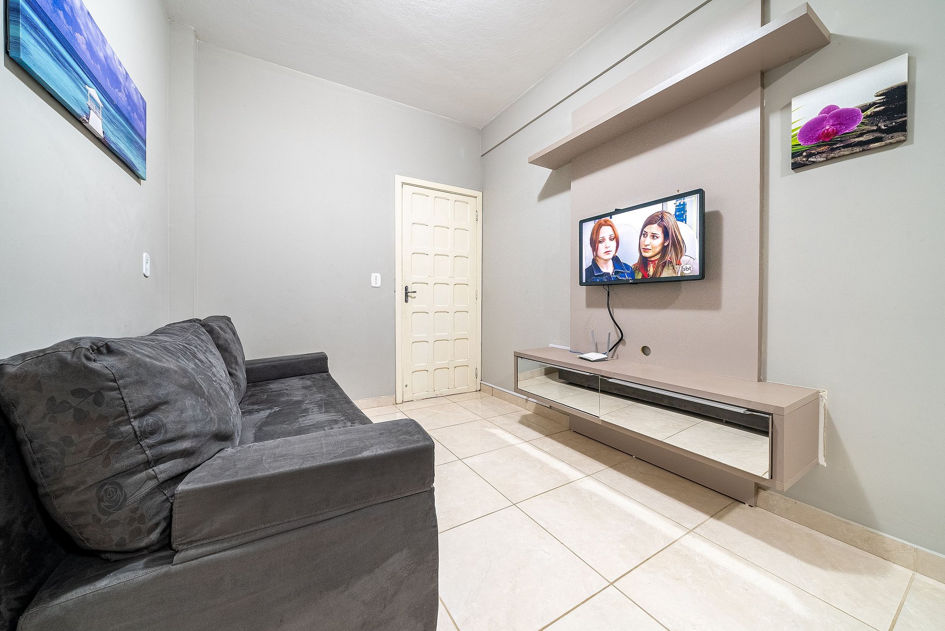 Sala de estar com sofá de 03 lugares e TV LCD.