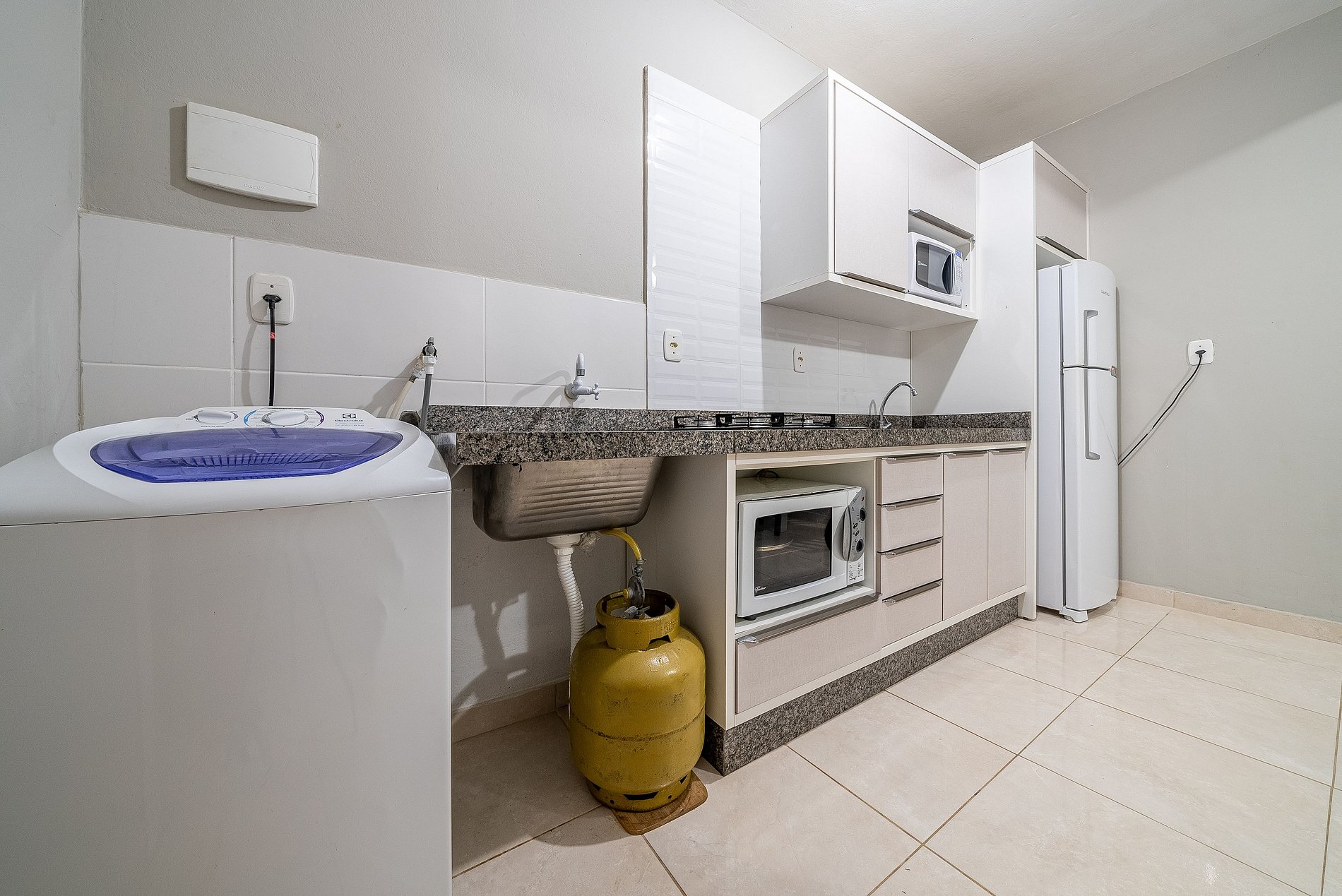 Cozinha muito bem equipada com geladeira, forno elétrico, micro-ondas, fogão de mesa 04 bocas e demais utensílios de cozinha.