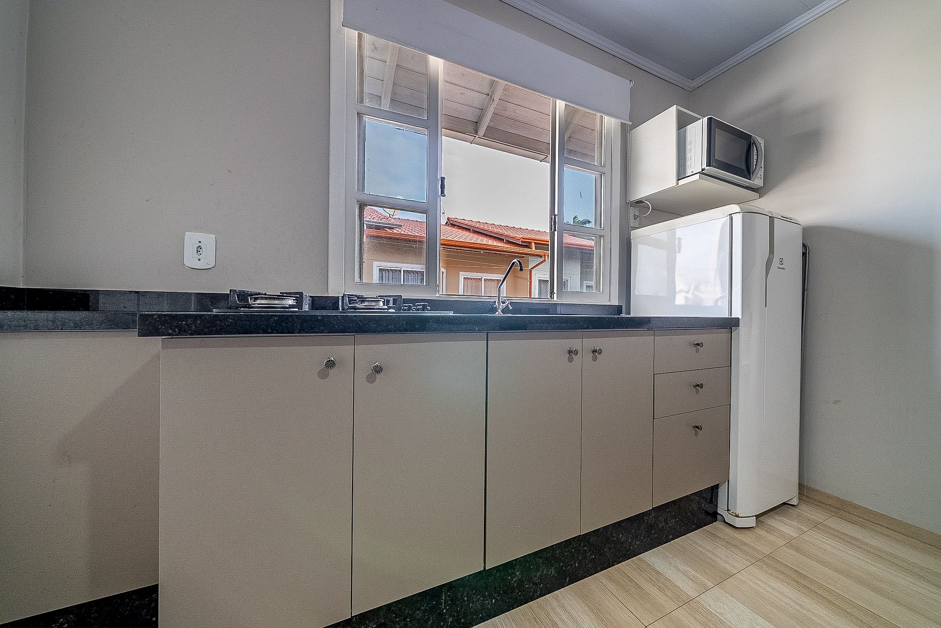 Cozinha equipada com geladeira, fogão e micro-ondas.