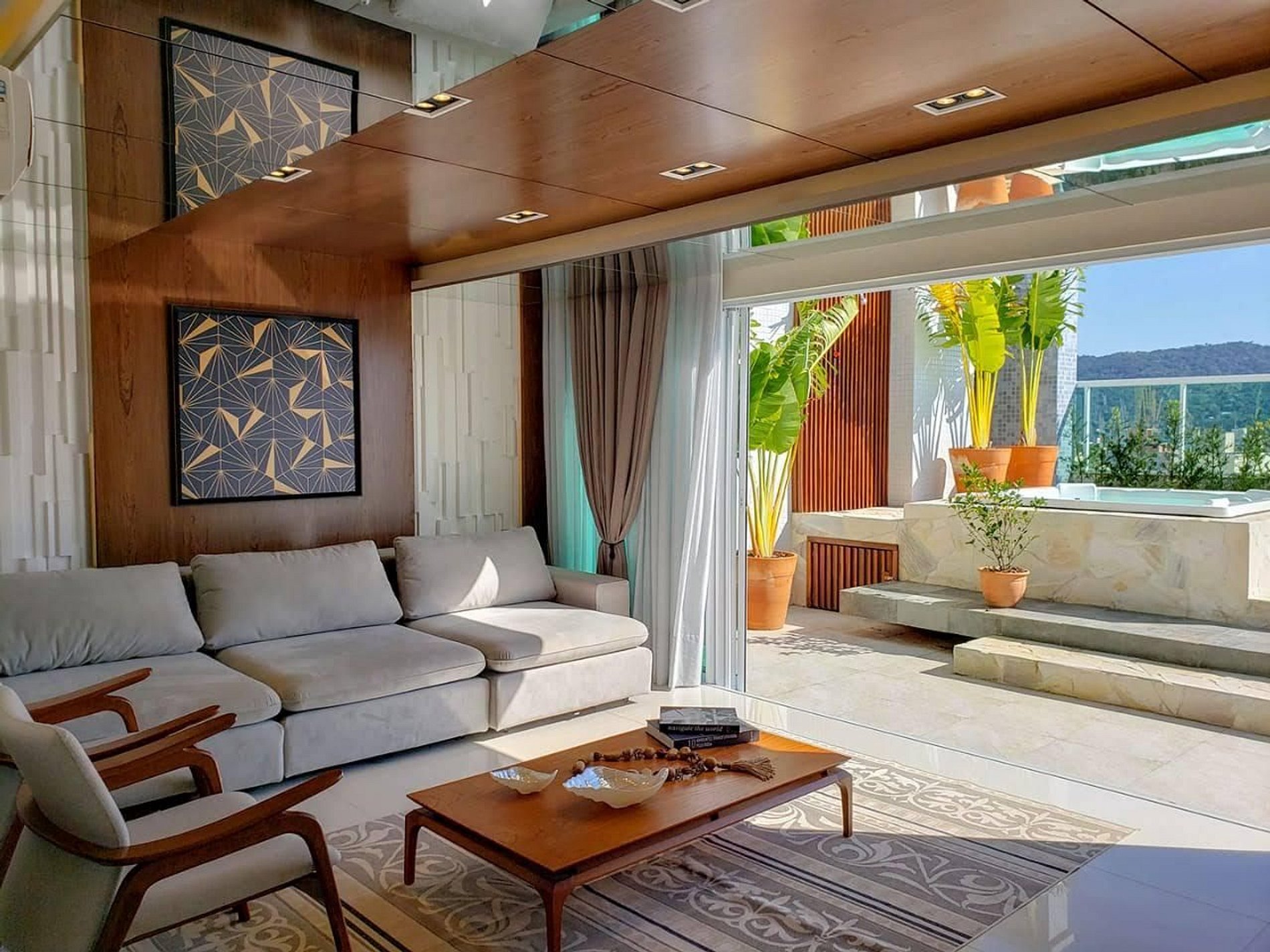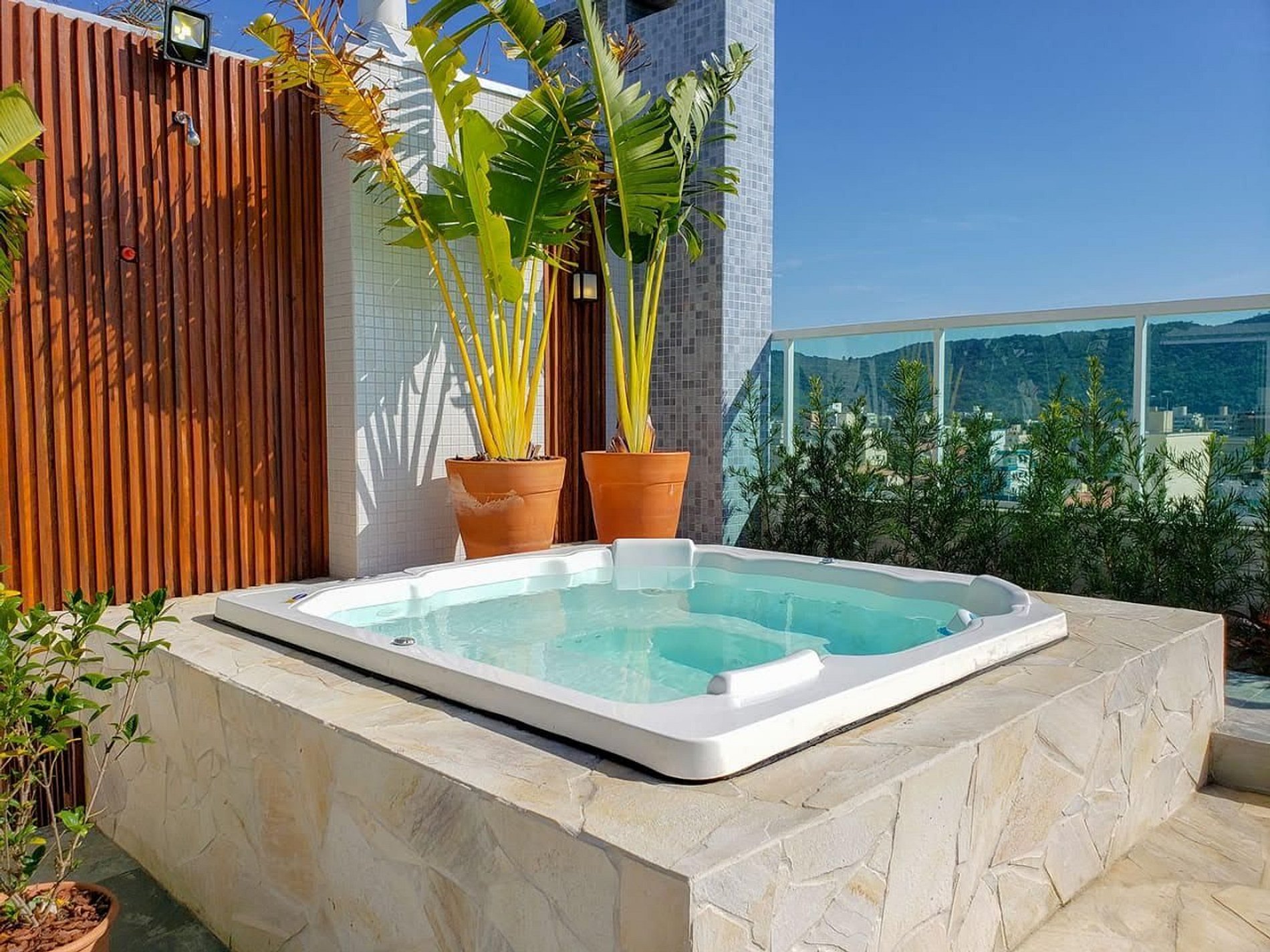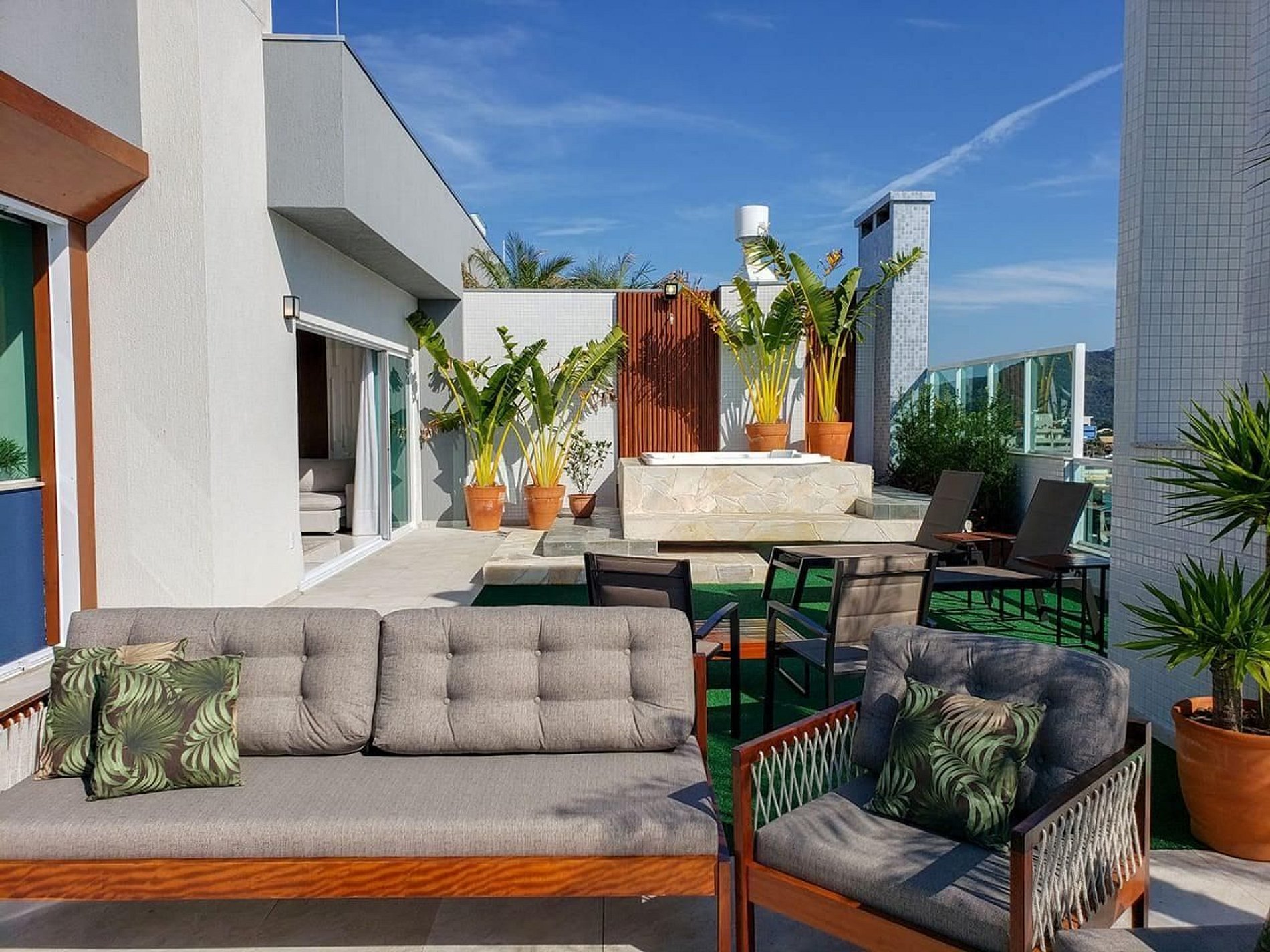 Terraço amplo com Jacuzzi aquecida, espreguiçadeiras, e sofás