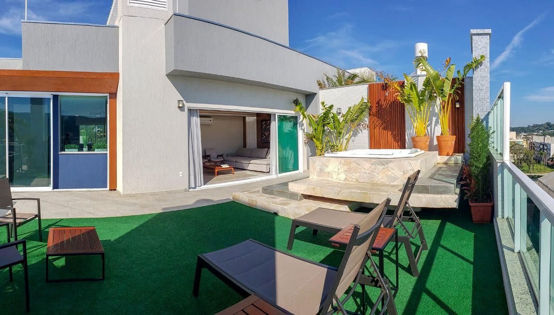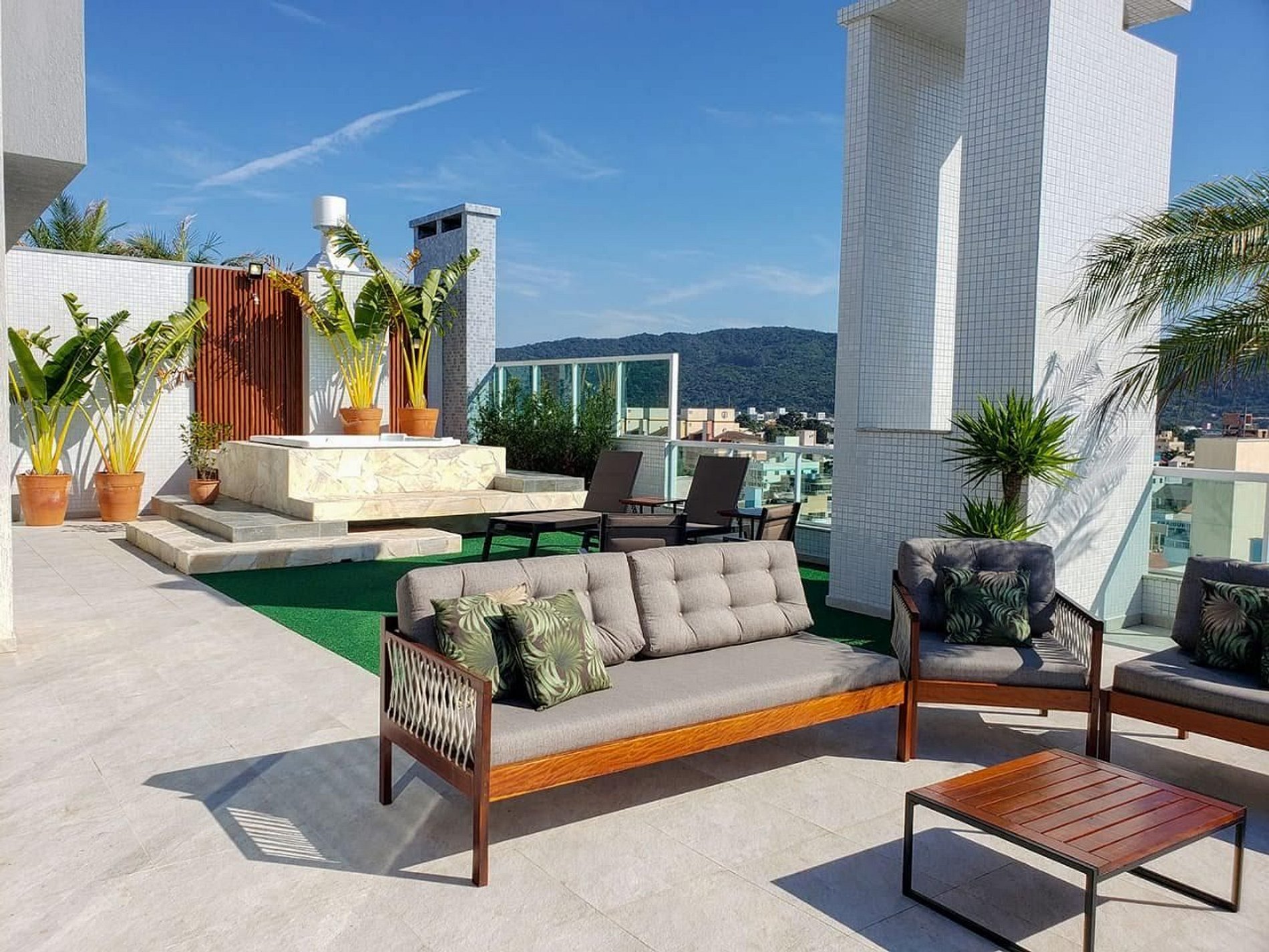 Terraço amplo com Jacuzzi aquecida, espreguiçadeiras, e sofás