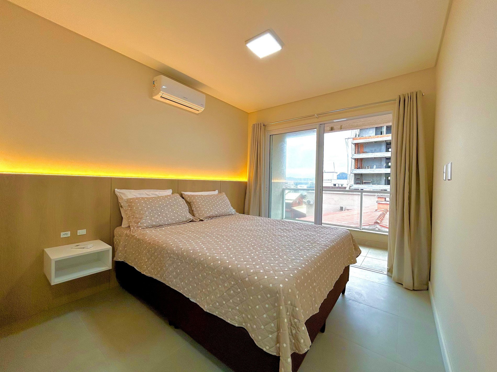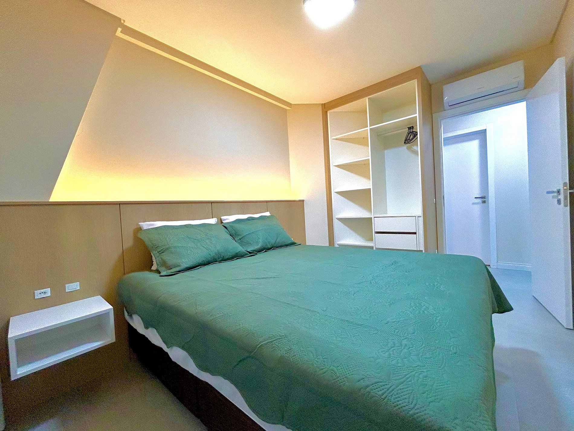 01 dormitório com cama de casal, com ar condicionado.