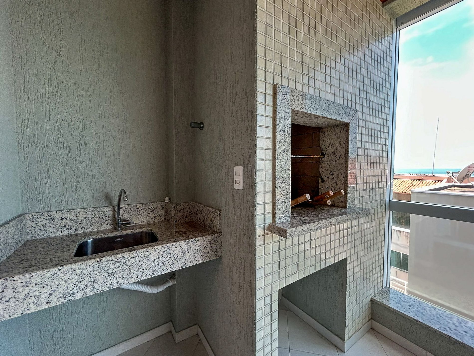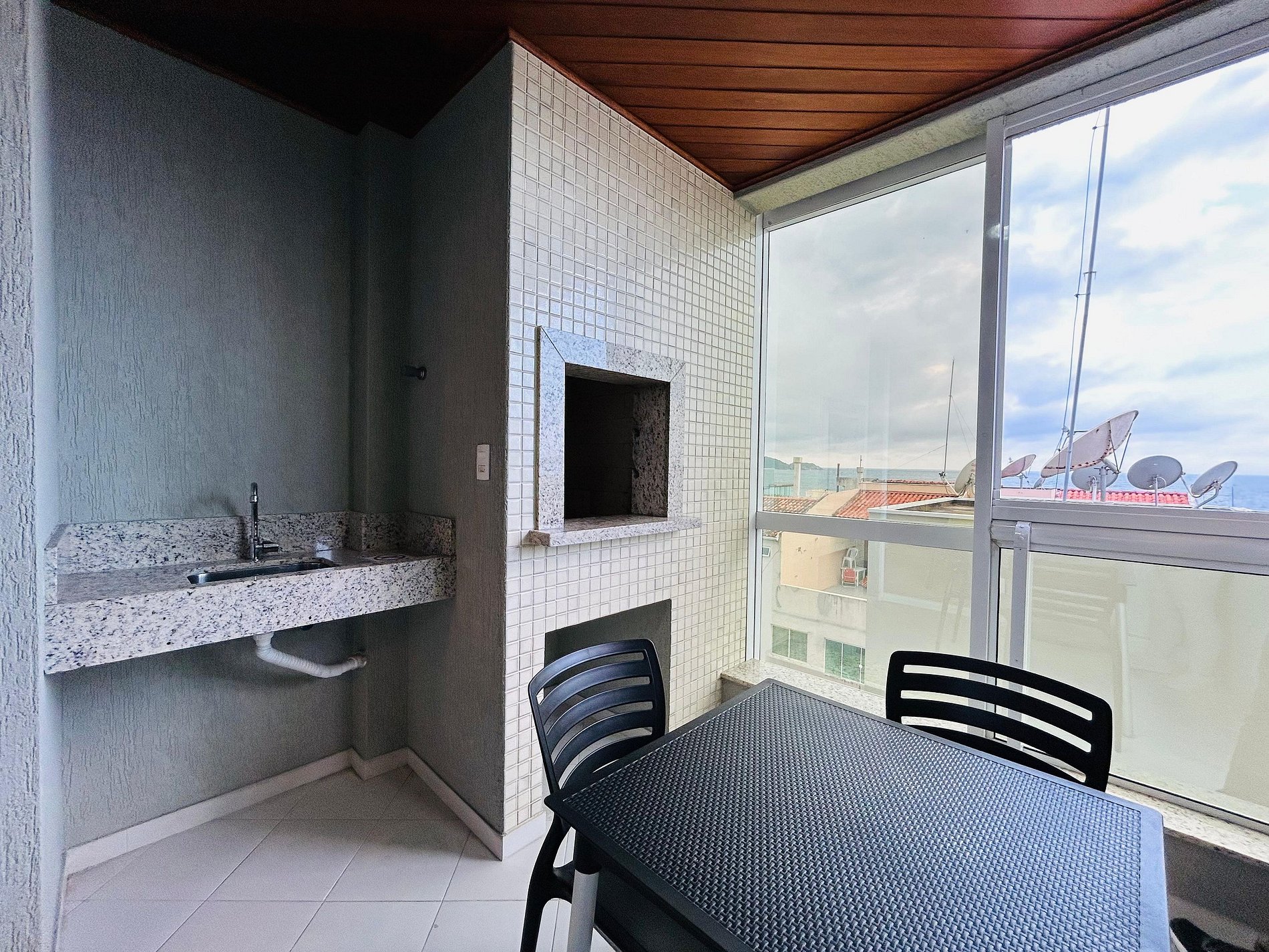 Sala de estar integrada com sacada fechada em reiki e churrasqueira;