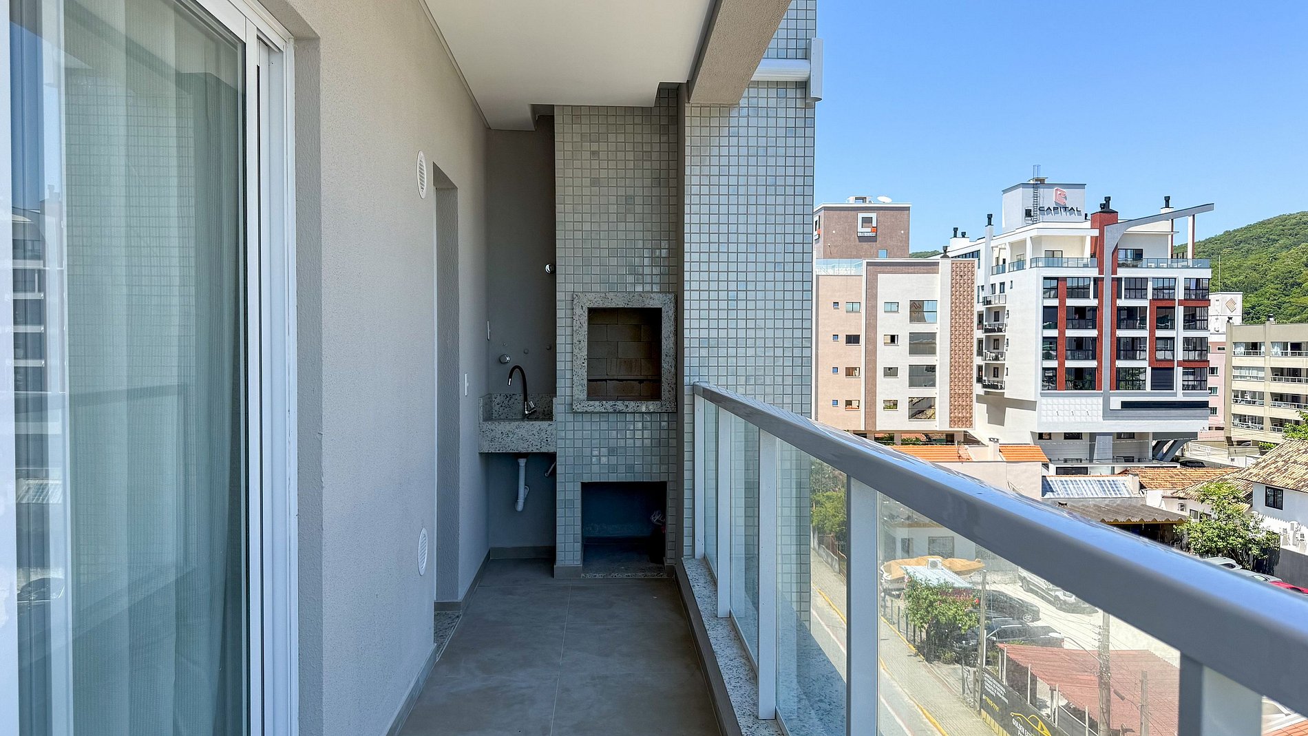 Sacada com churrasqueira e vista mar;