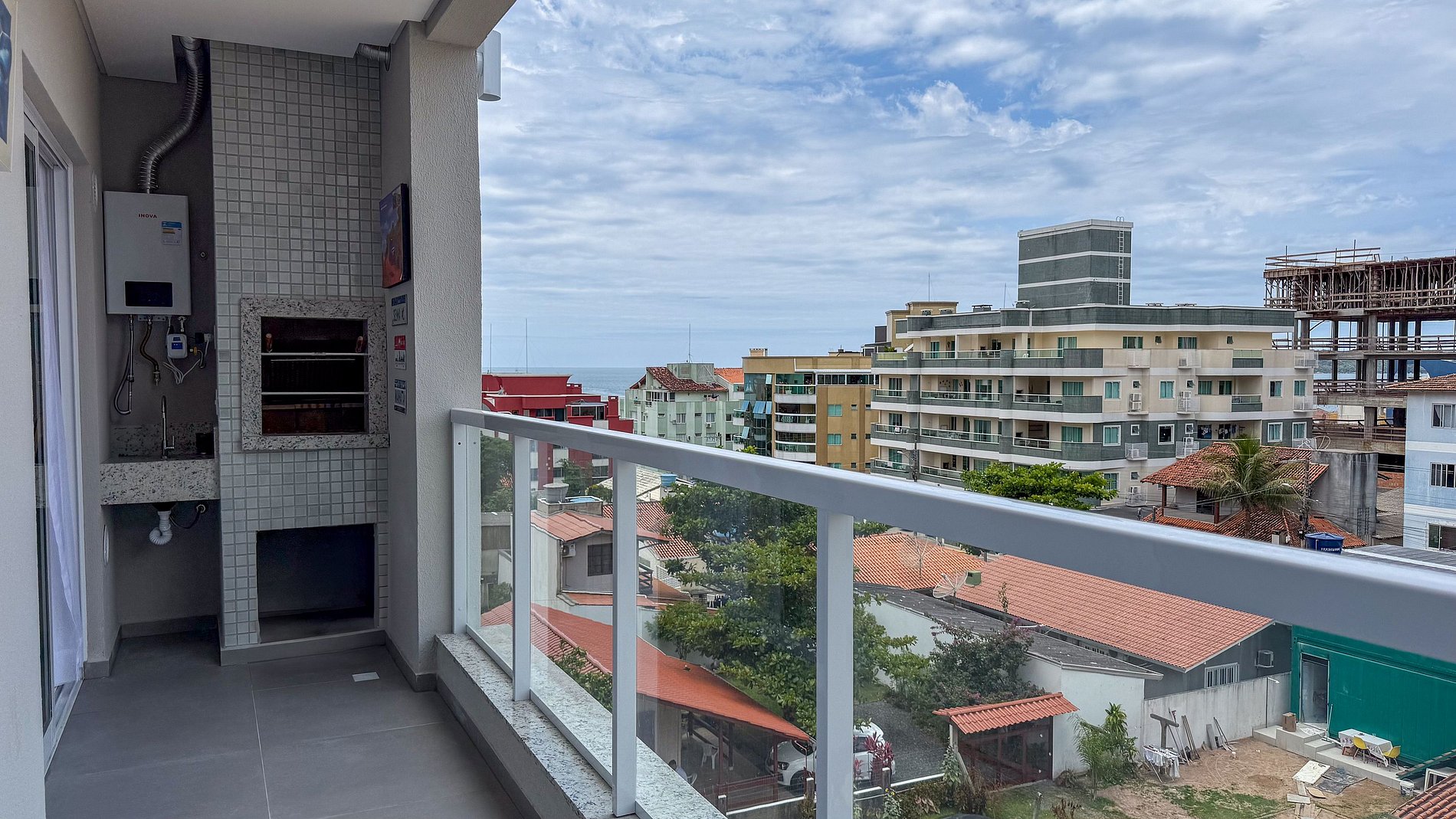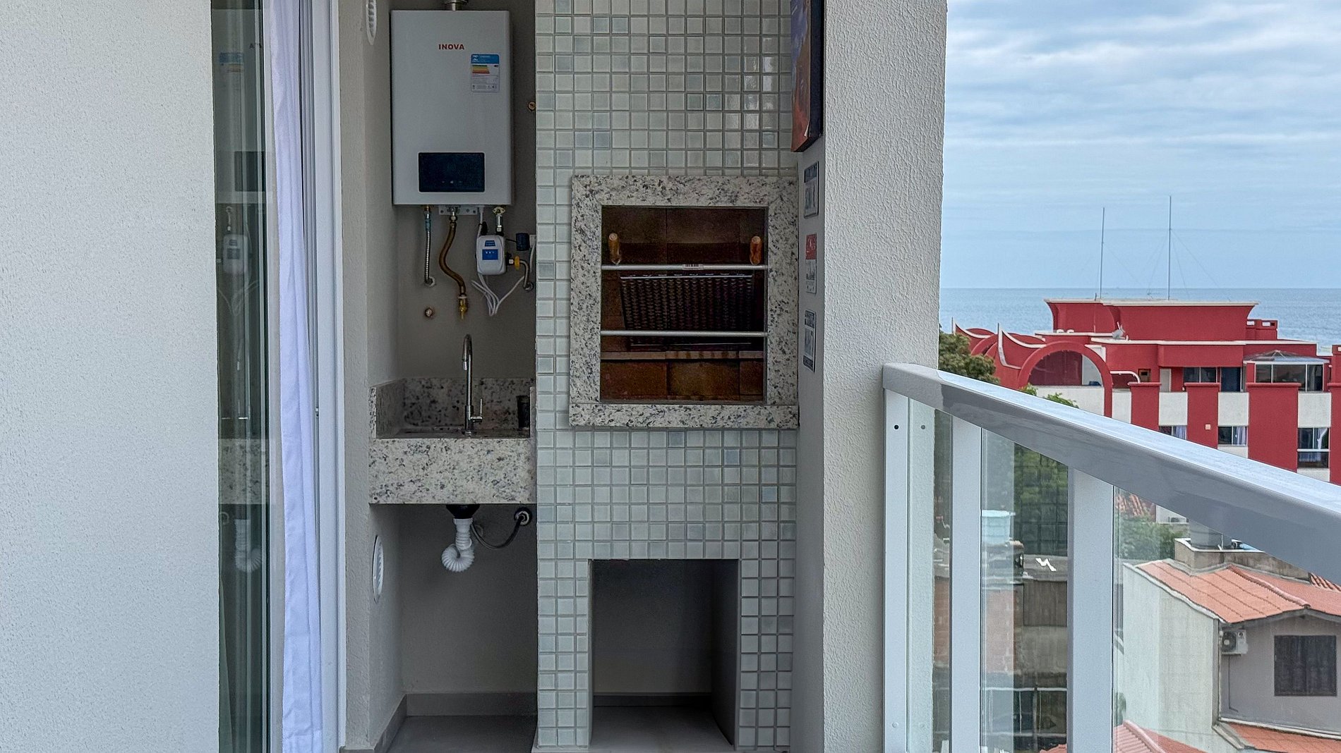 Sacada com churrasqueira e vista mar;