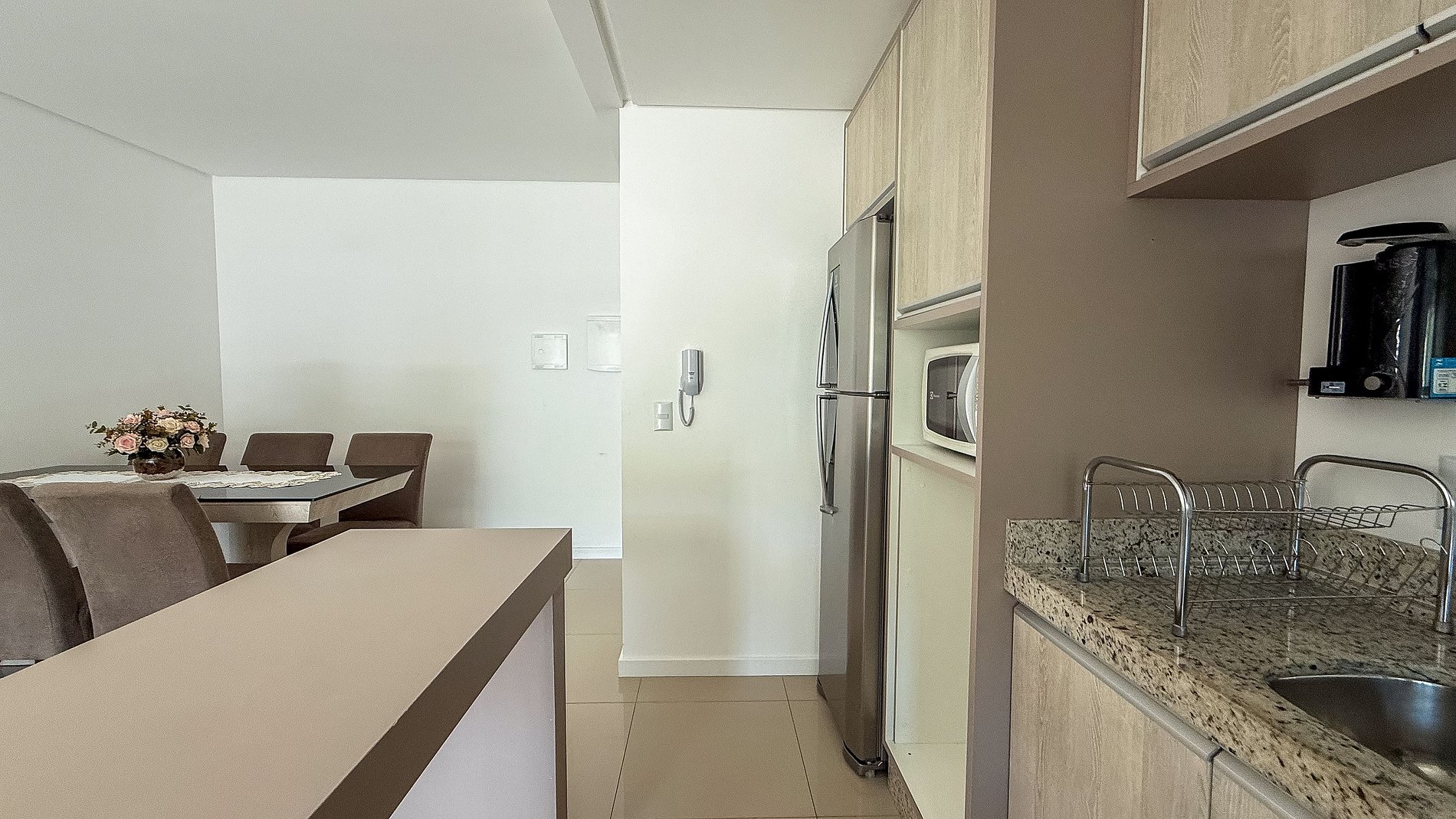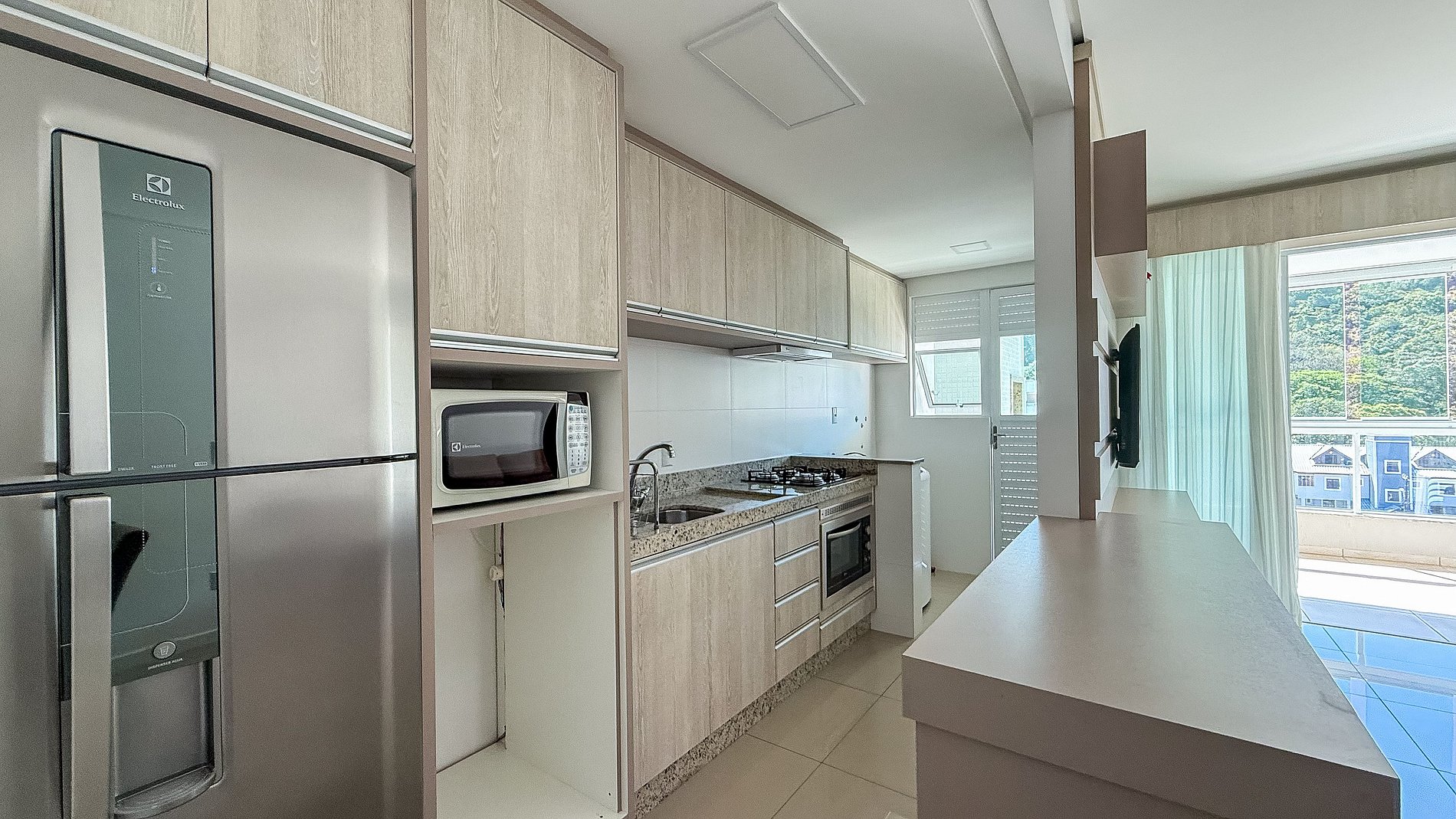 Cozinha completa com geladeira, micro-ondas, forno elétrico e churrasqueira;