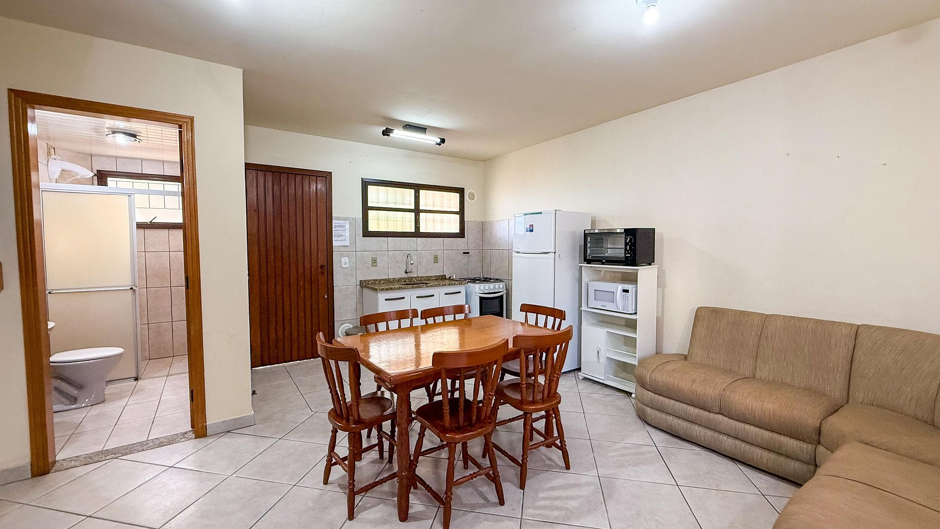Cozinha completa com geladeira, micro-ondas, forno elétrico;