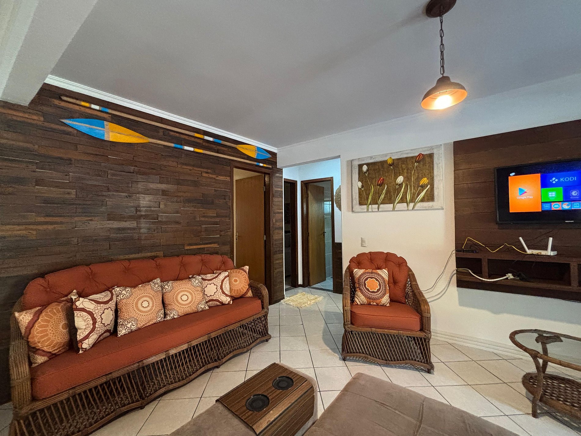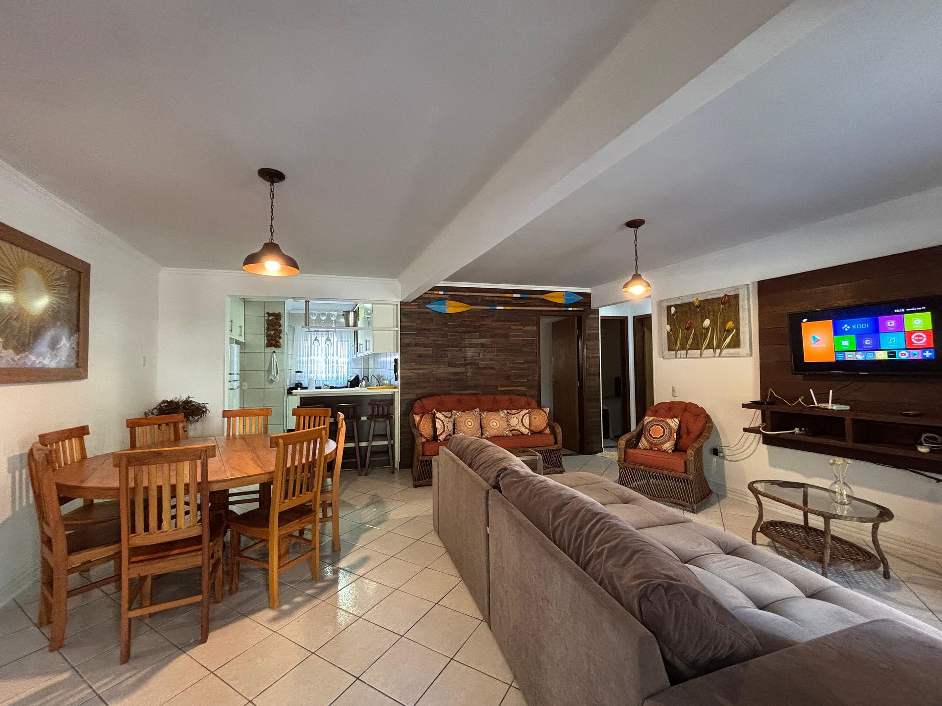 Sala de estar com amplo sofá e TV SMART na sala