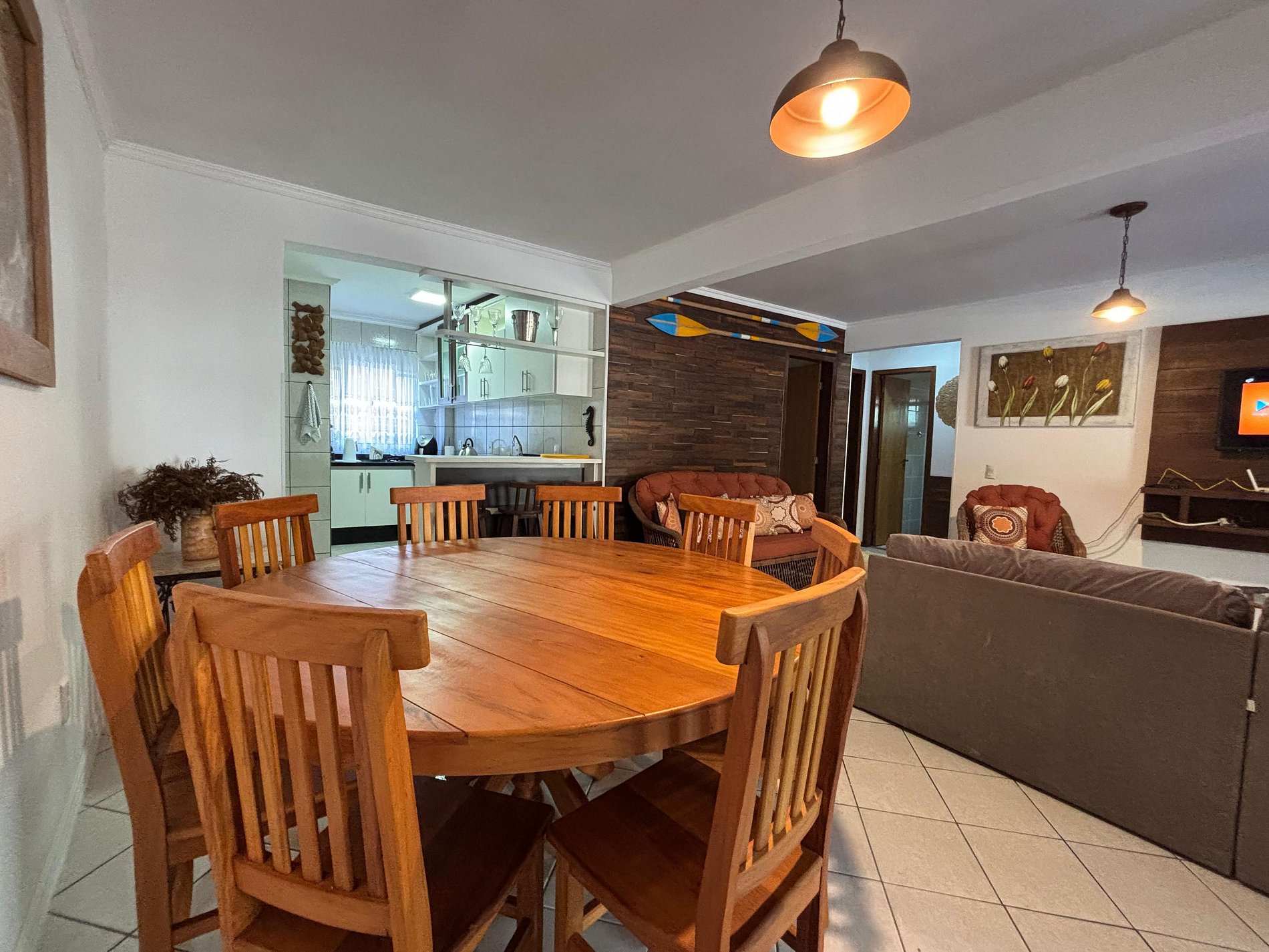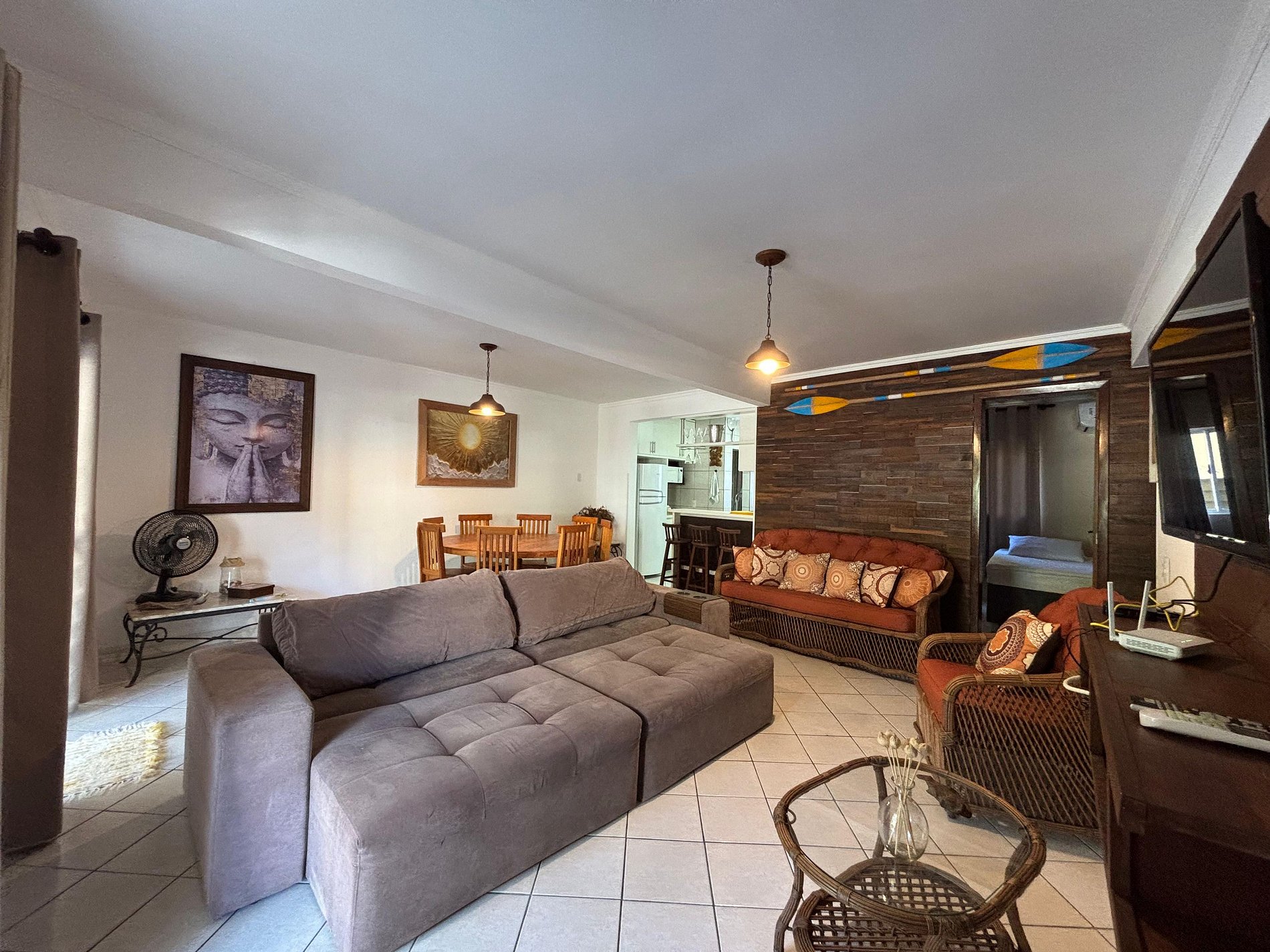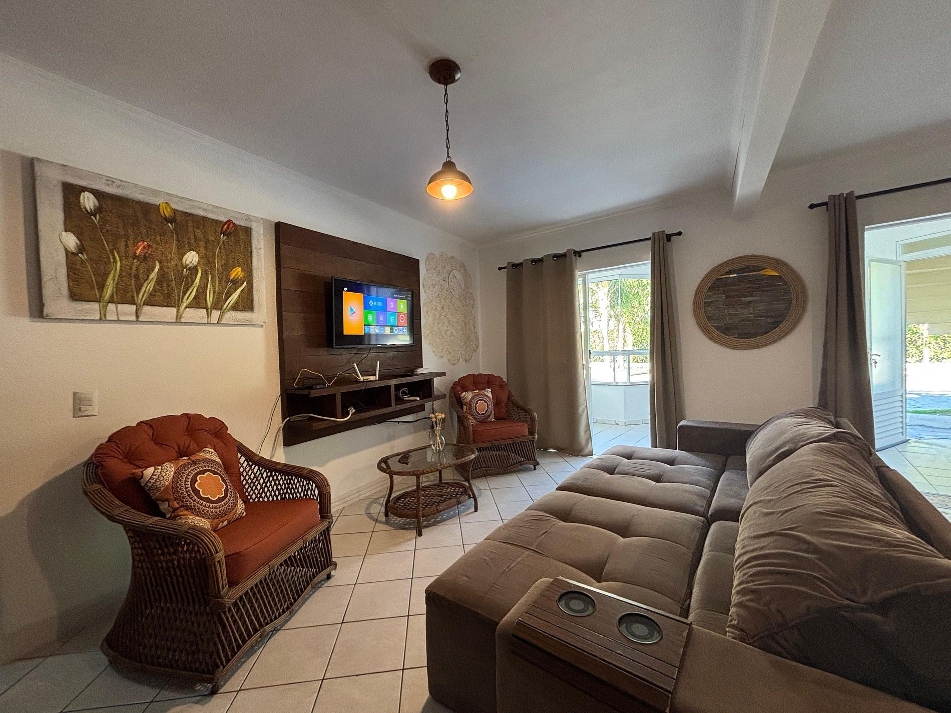 Sala de estar com amplo sofá e TV SMART na sala