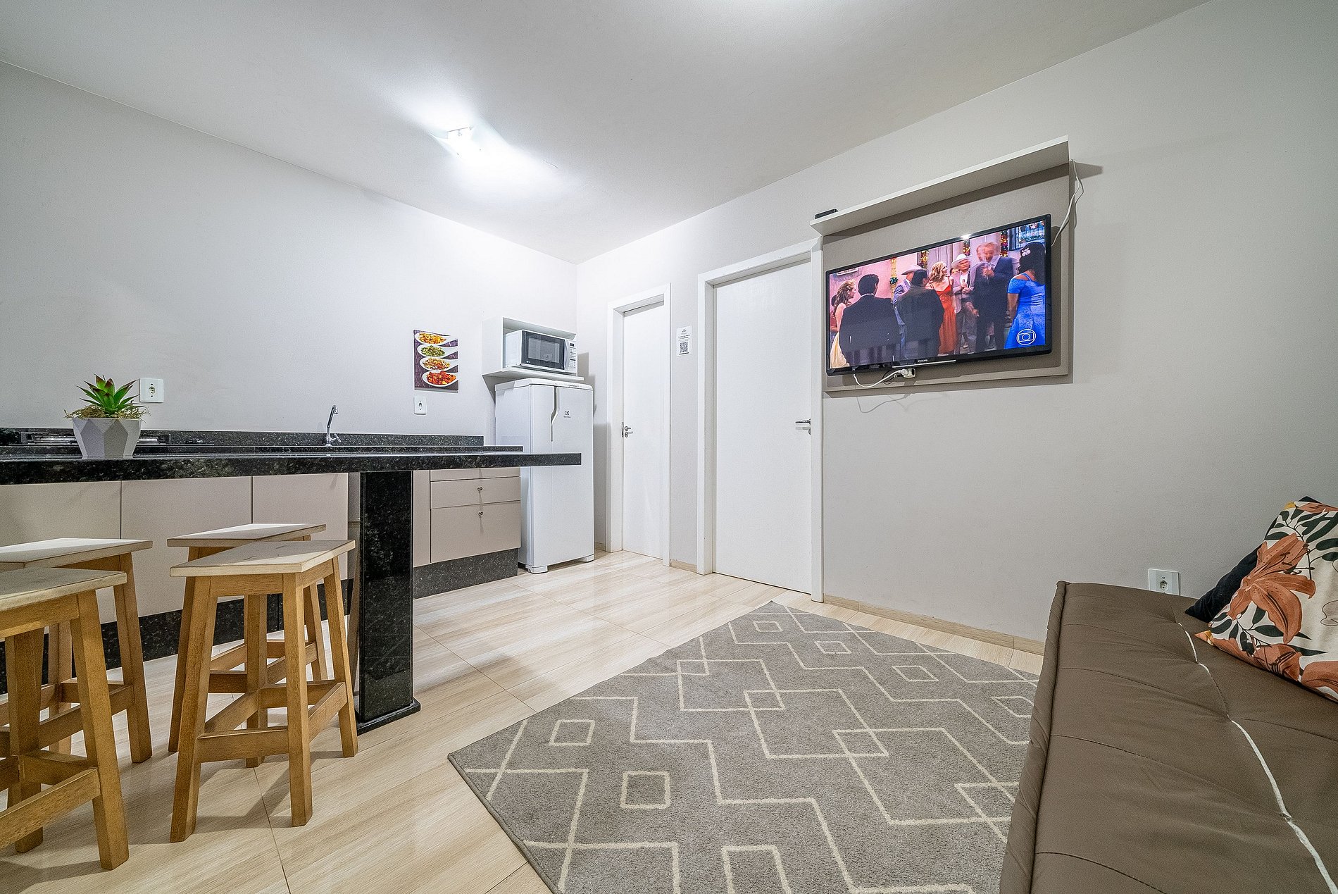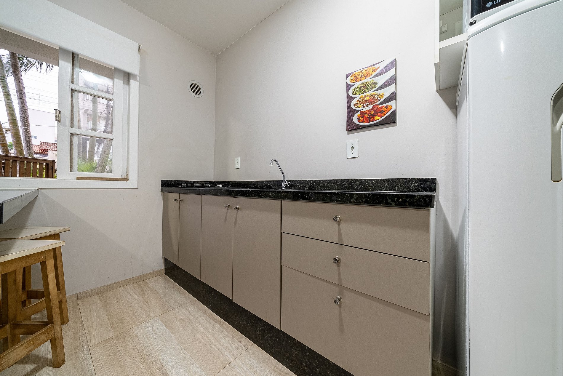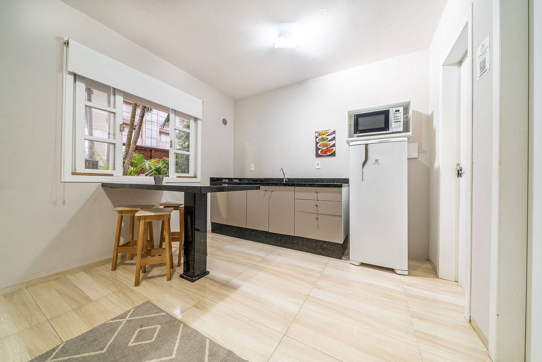 Cozinha equipada com geladeira, fogão e micro-ondas.