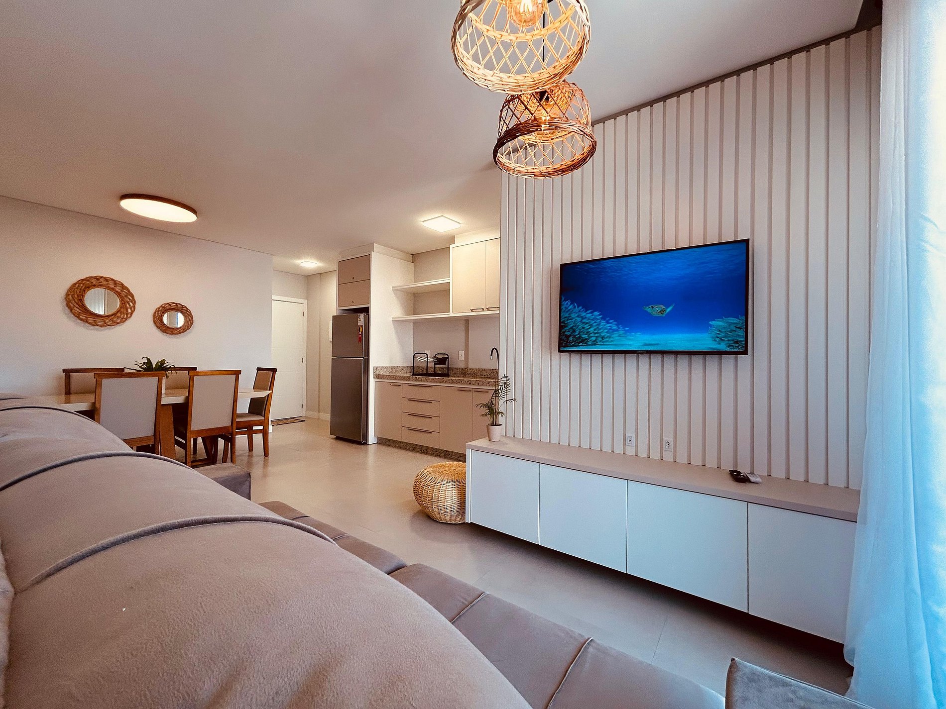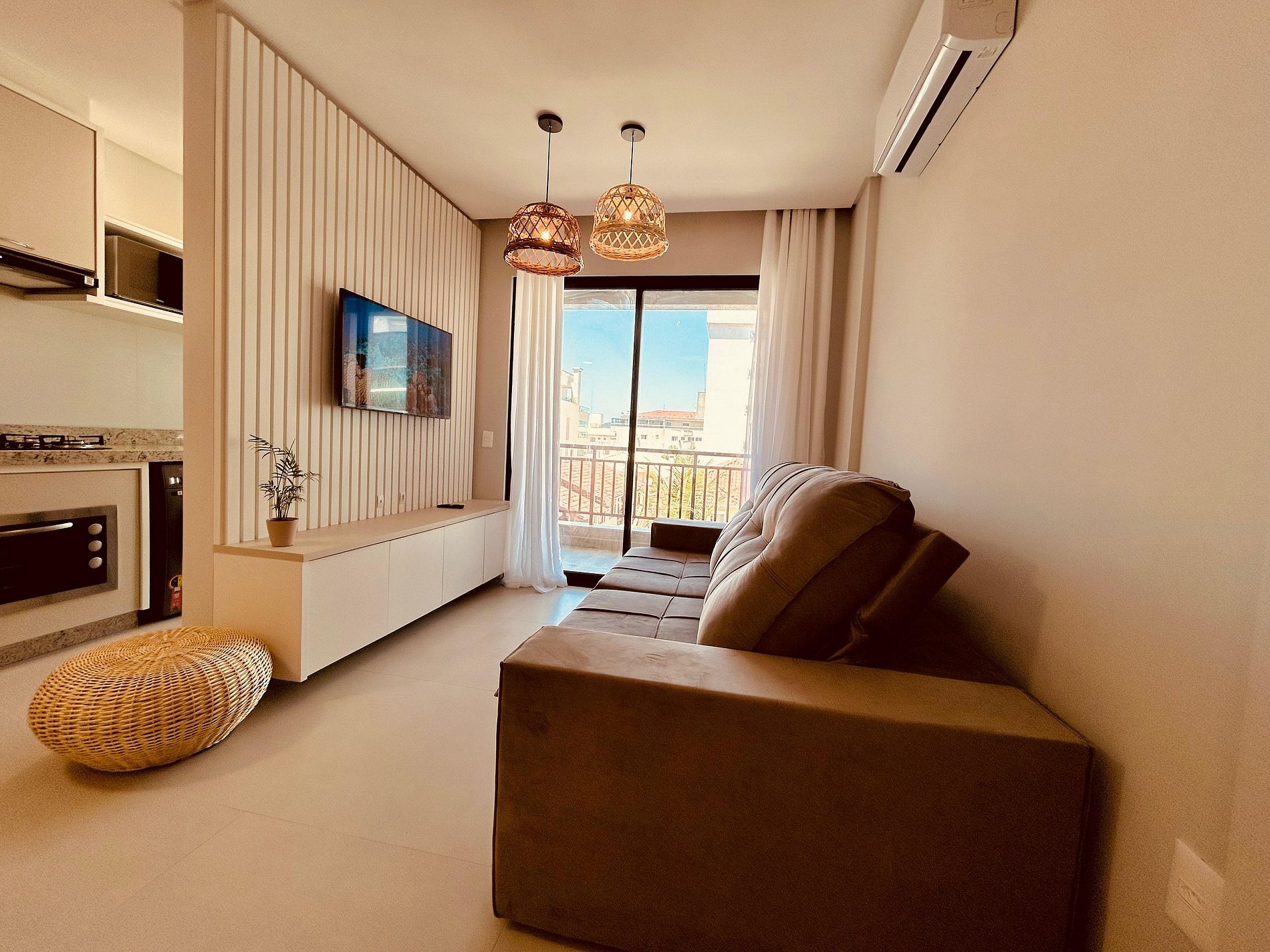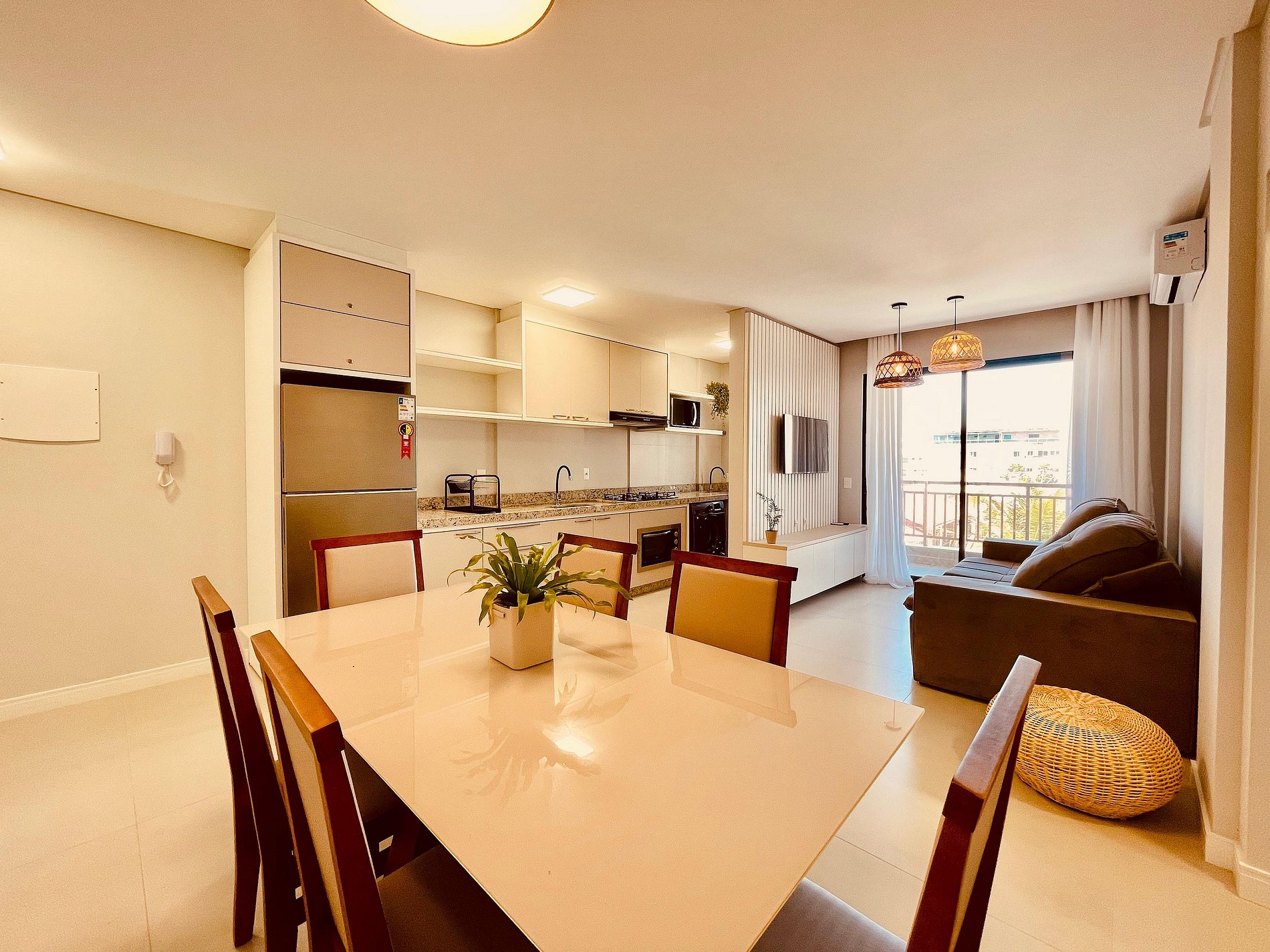 Sala de estar integrada com sala de jantar climatizada;