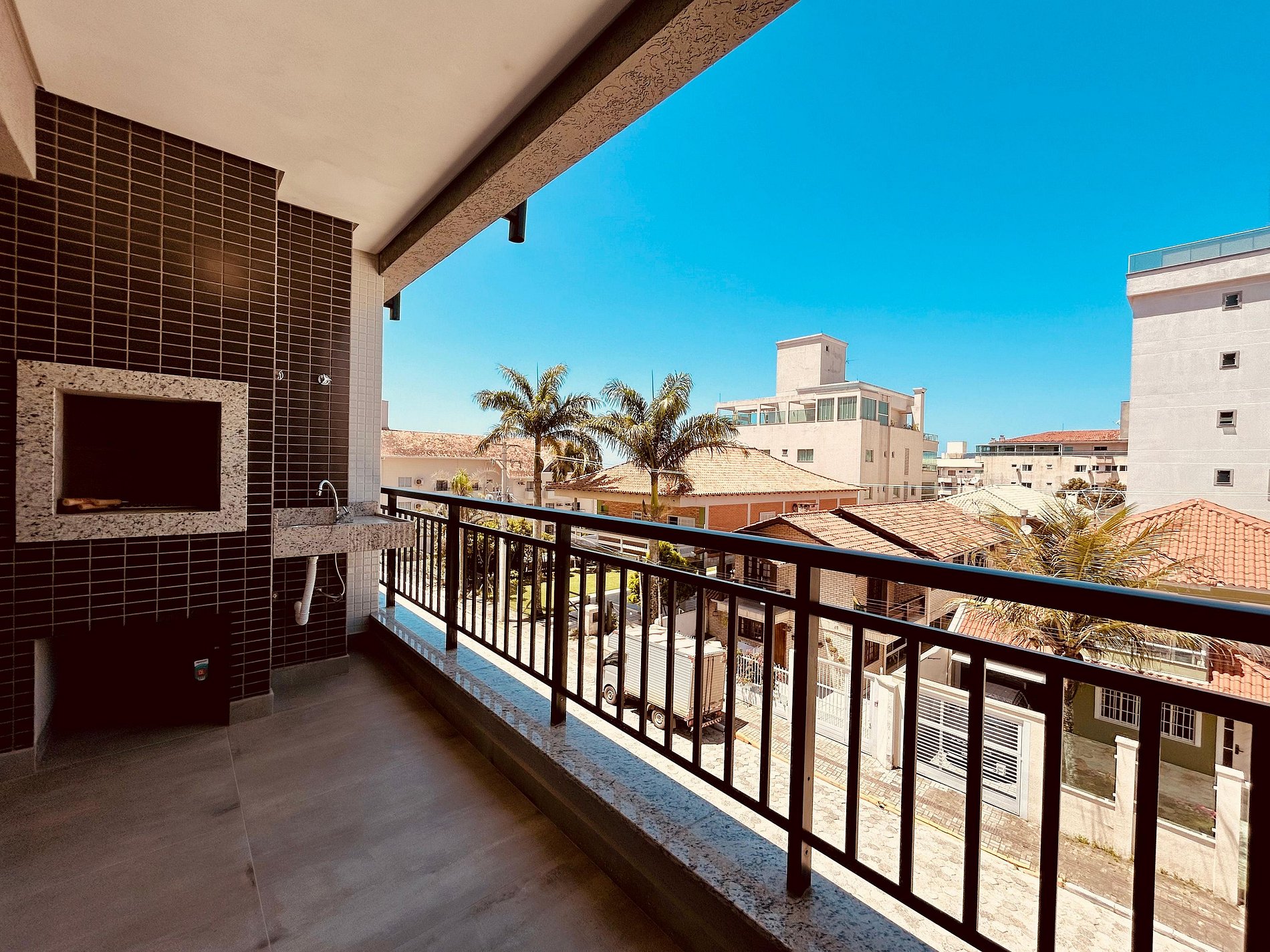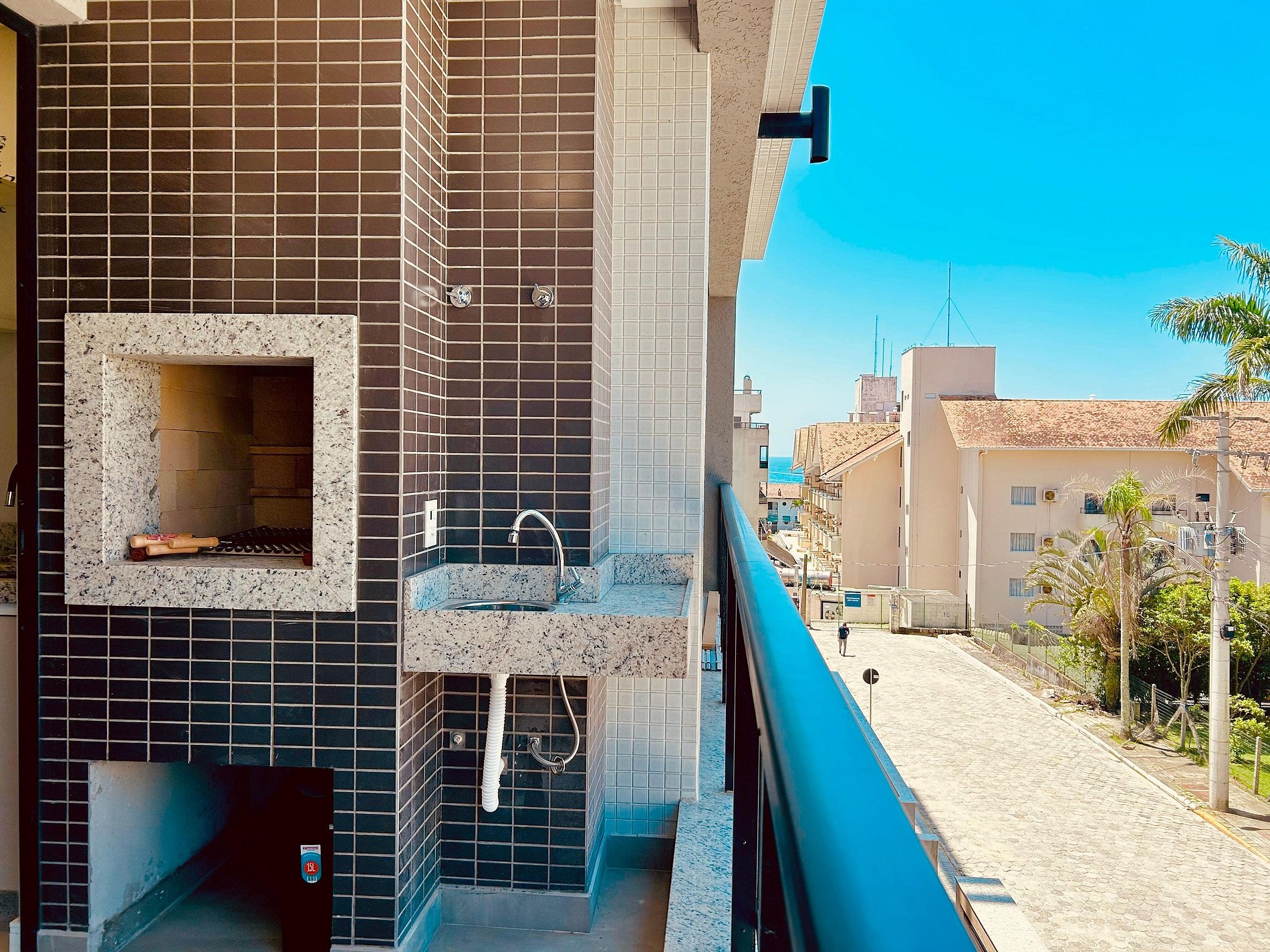 Sacada com churrasqueira e vista para a rua;