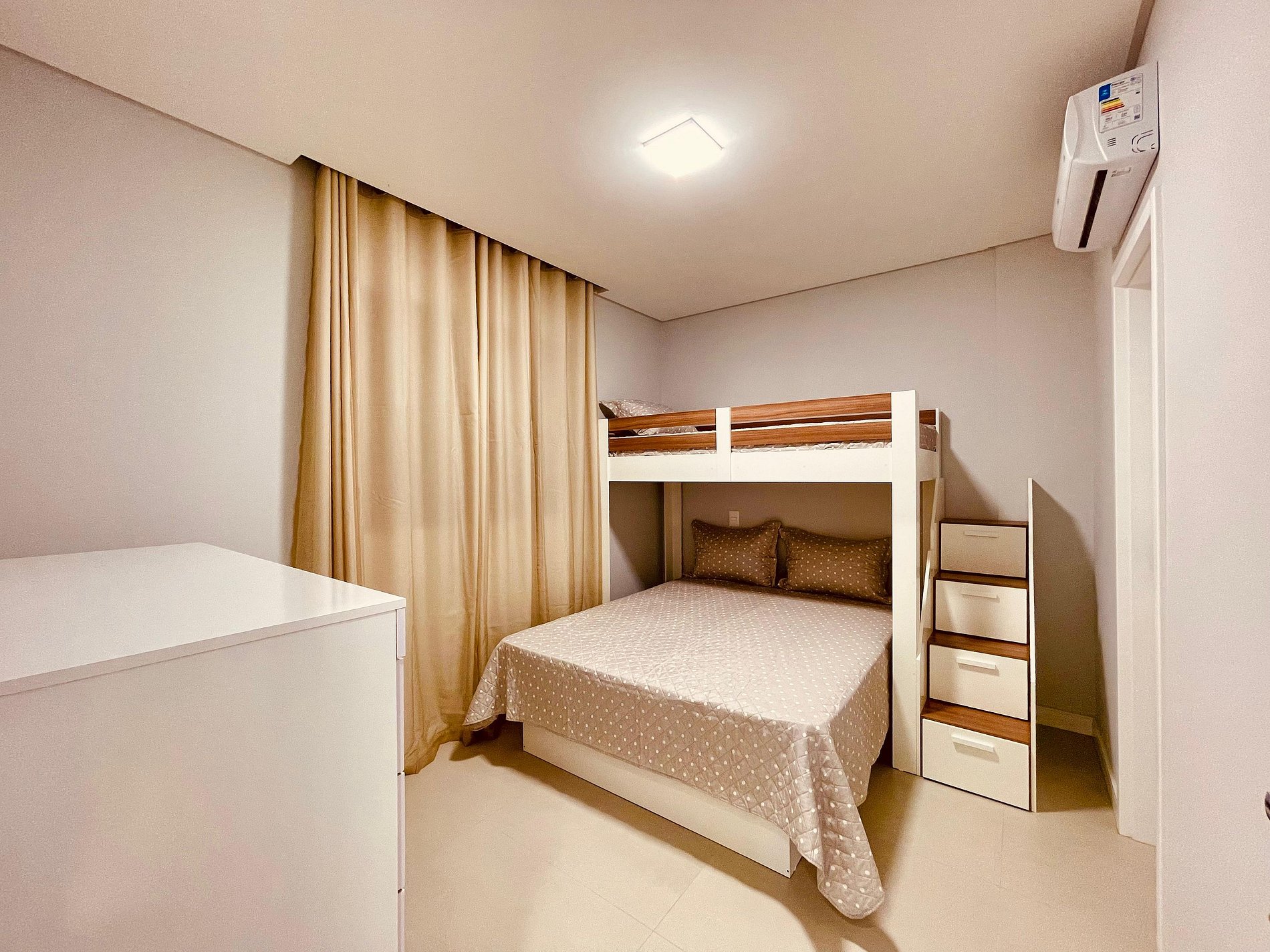 1 suíte climatizada com cama de casal e uma beliche de solteiro;