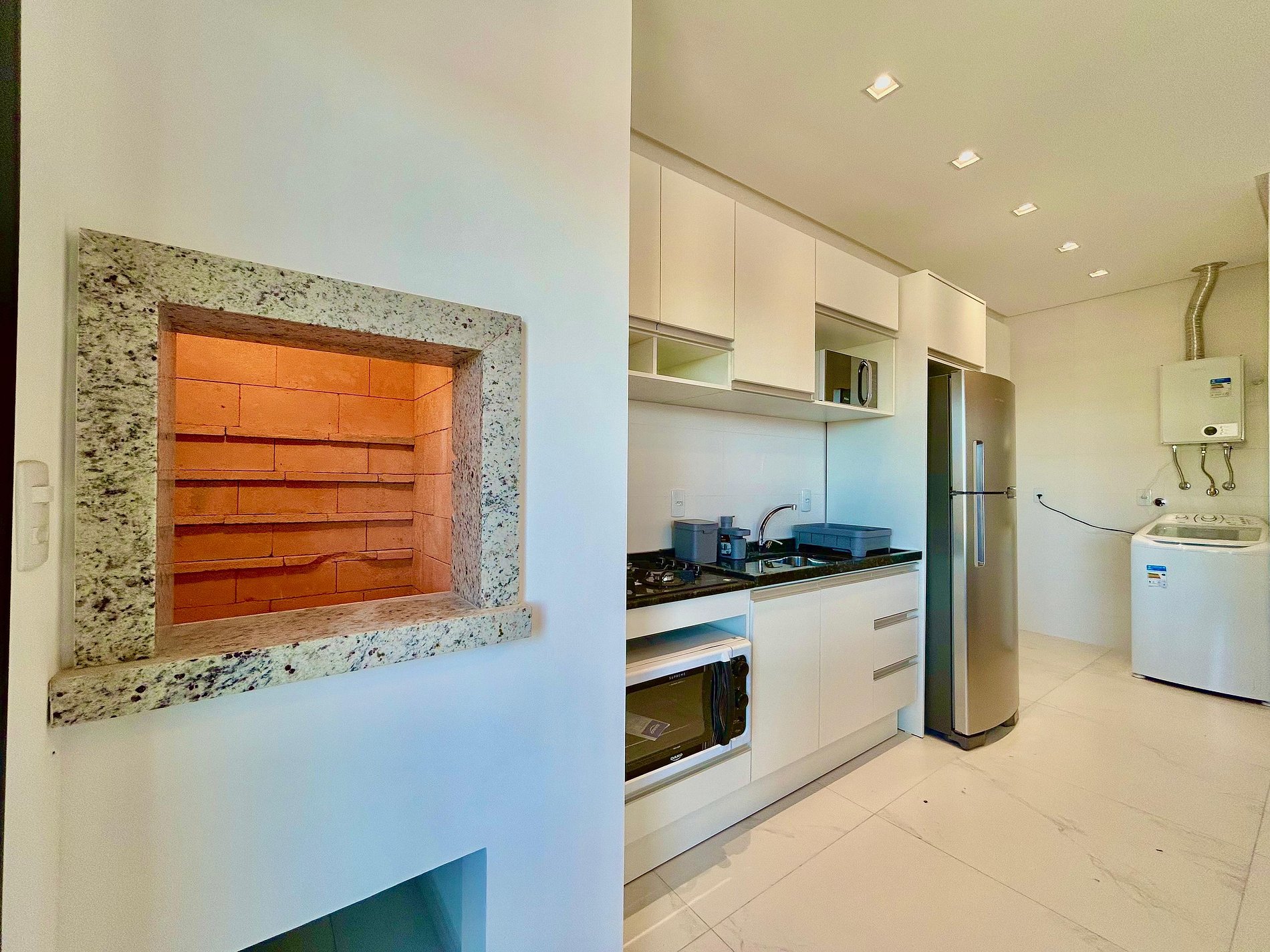 Cozinha completa com churrasqueira e com sala de estar e jantar integradas;